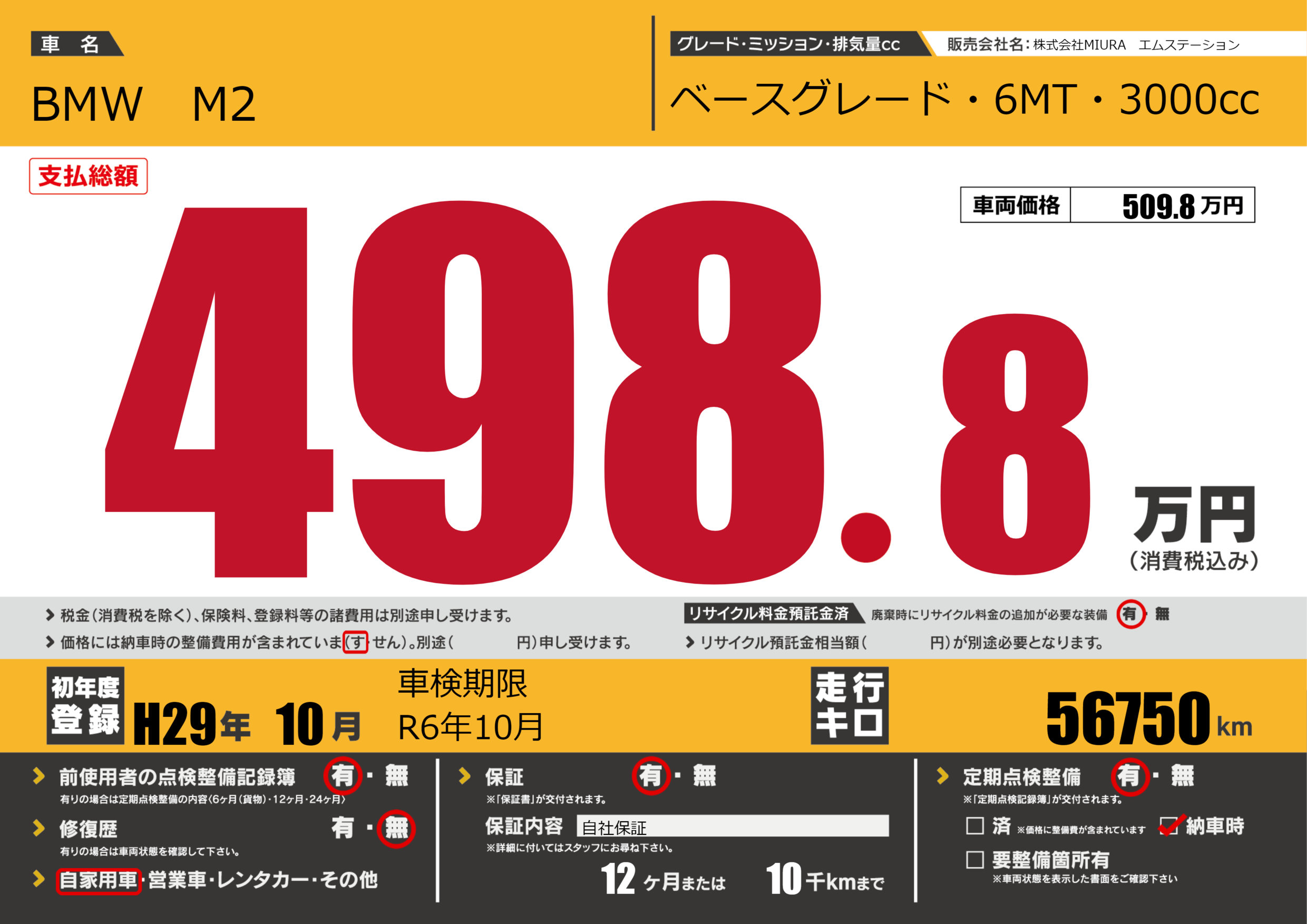 | 車名 | BMW M2 | グレード ミッション 排気量 |