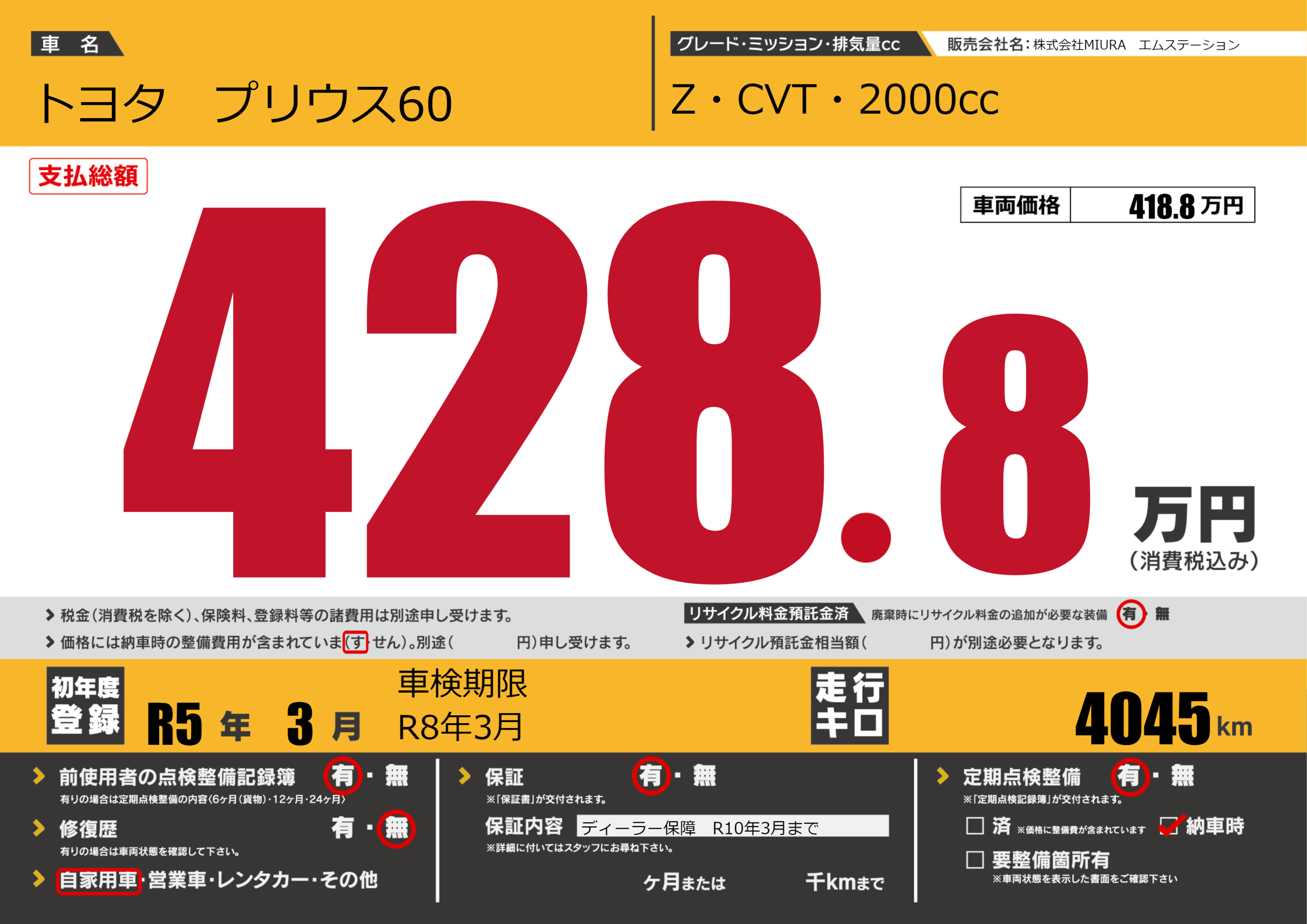 | 走行キロ | 404.5万km | 初年度登録 | R5年3月 |