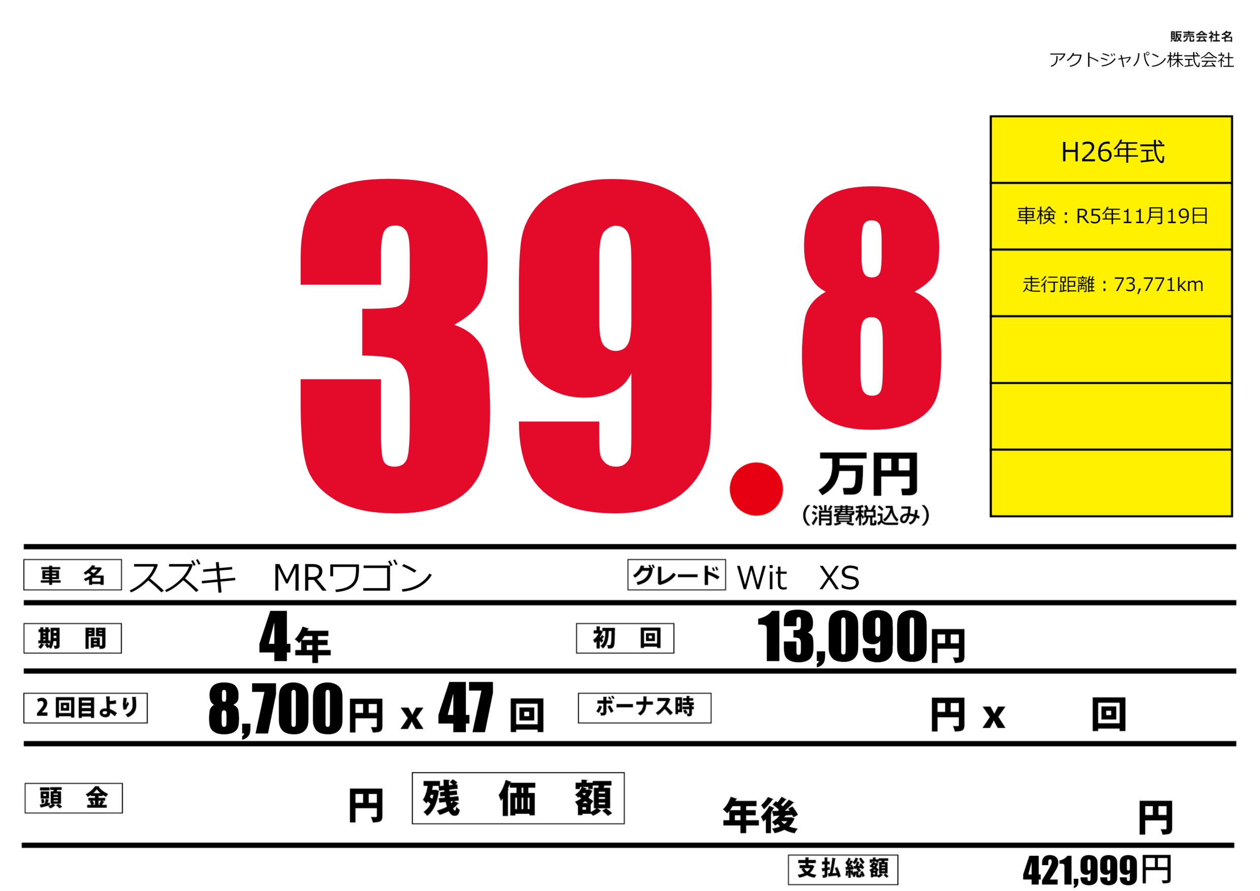 | 車名 | スズキ MRワゴン | グレード ミッション 排気量 |