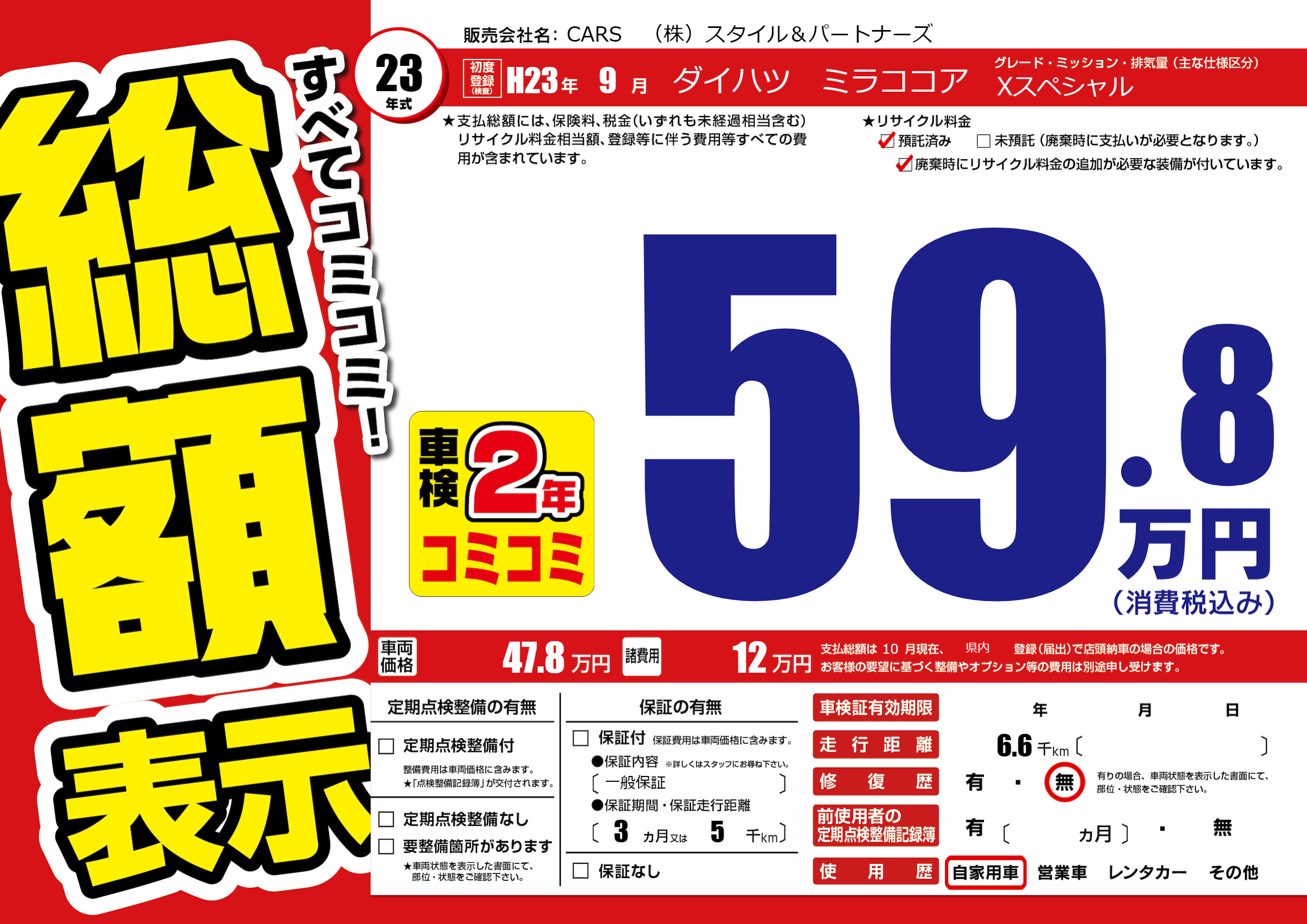 | 車名 | ダイハツ ミラココア | グレード ミッション 排気量 |