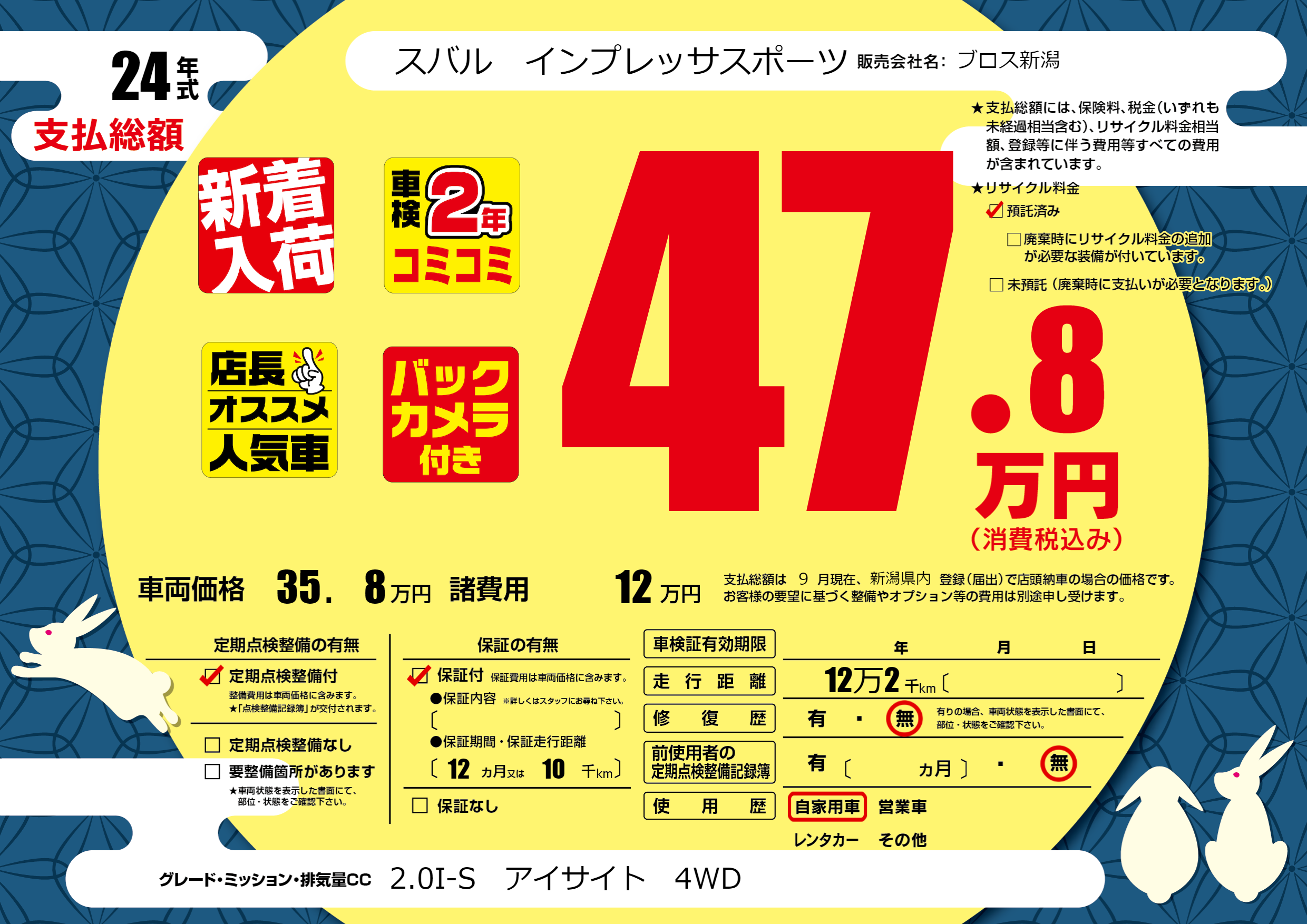 | 車名 | スバル インプレッサスポーツ | グレード ミッション 排気量 |