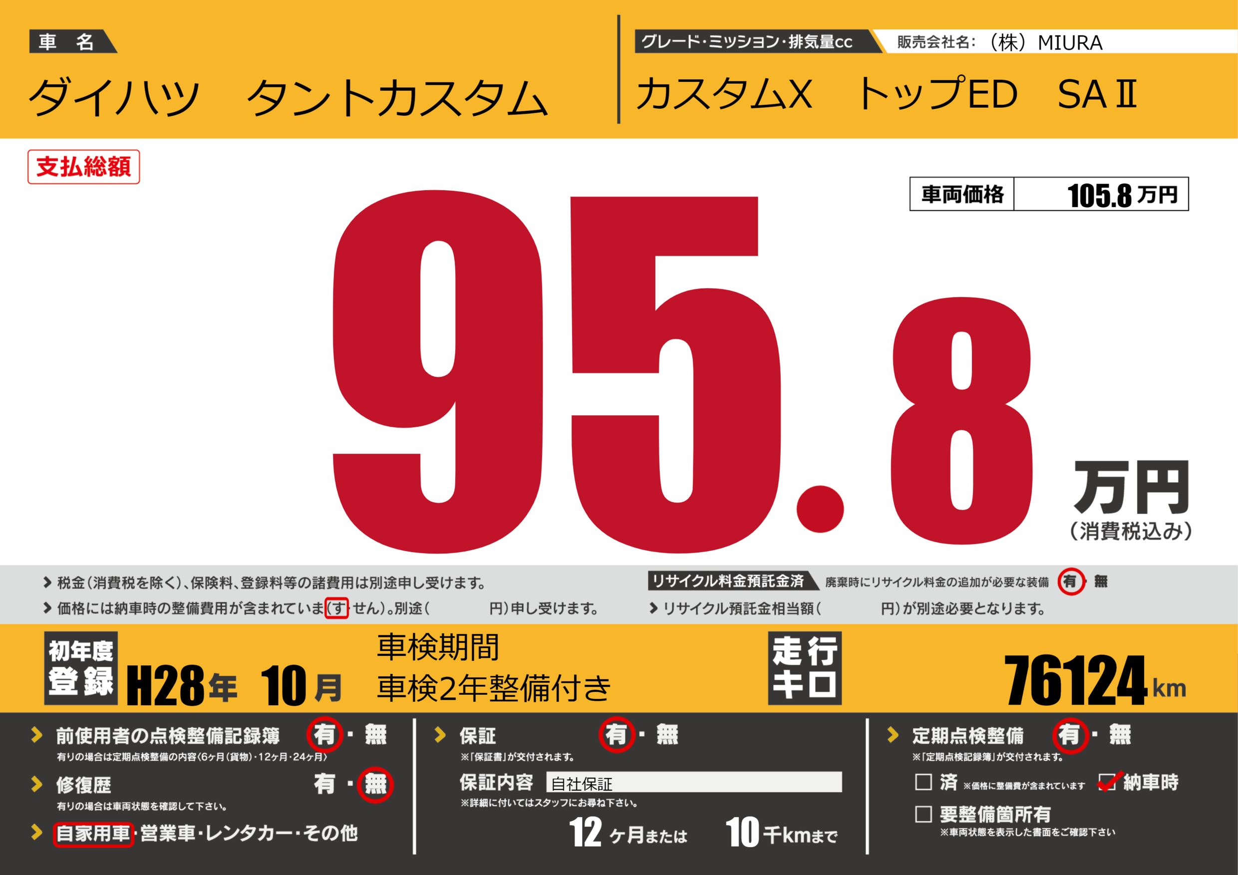 | 定期点検整備 | 定期点検整備あり 納車時あり | ||
