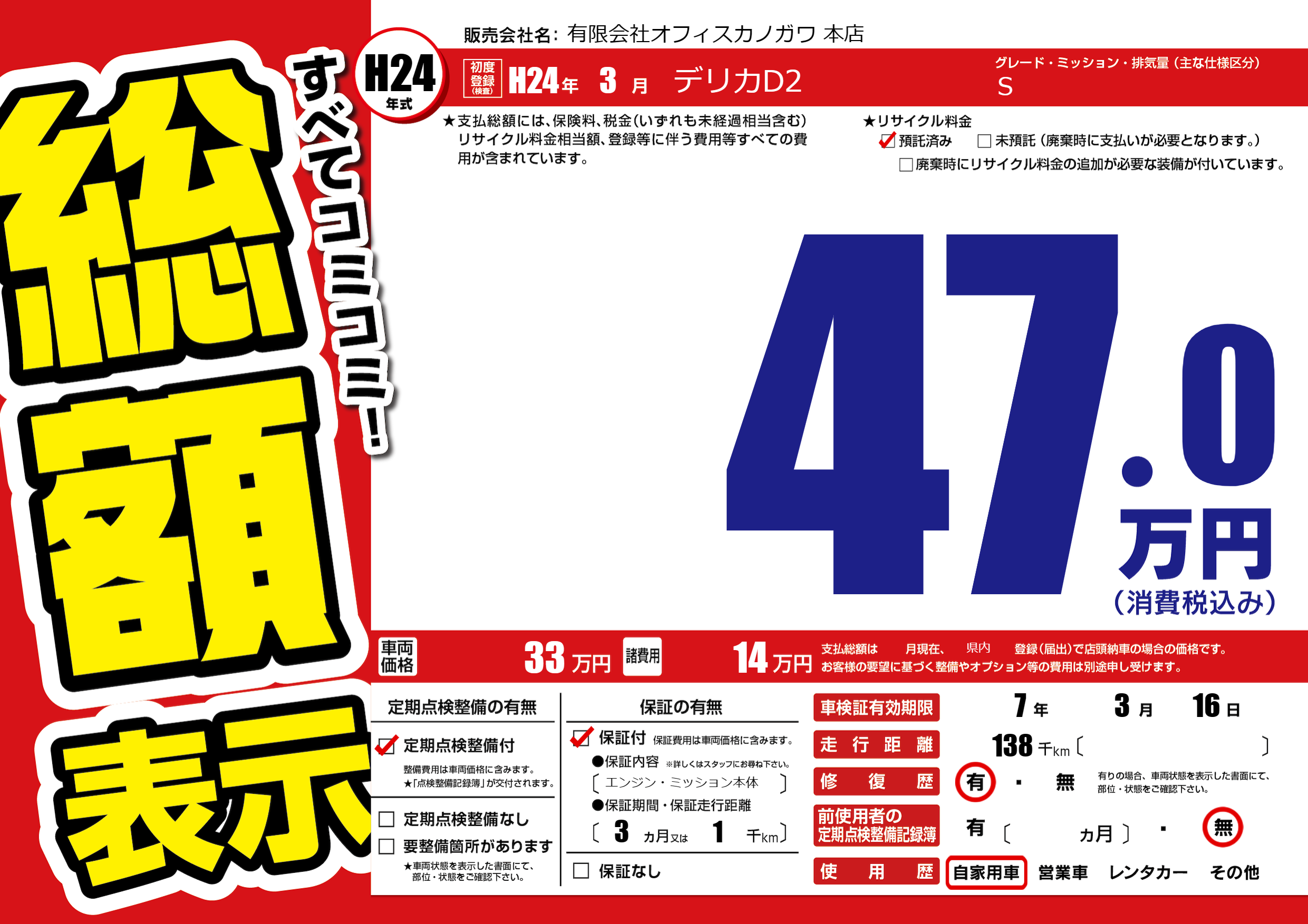 | 走行キロ | 13.8万km | 初年度登録 | H24年3月 |