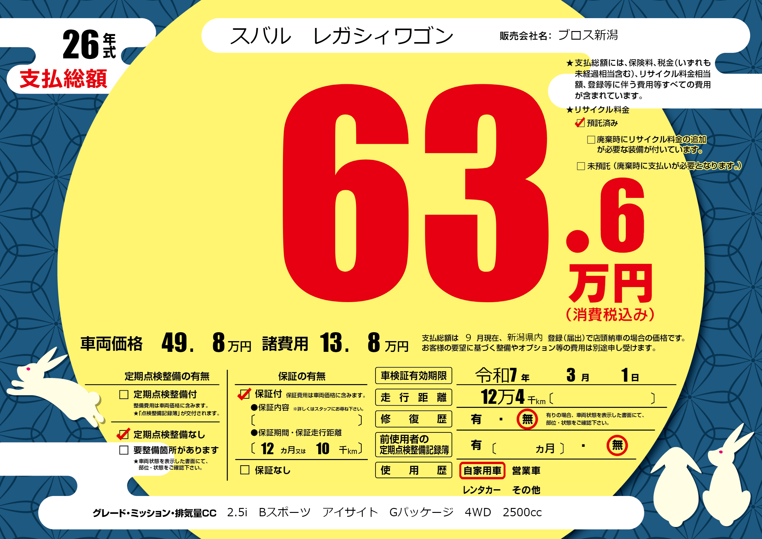 | 車名 | スバル レガシィワゴン | グレード ミッション 排気量 |