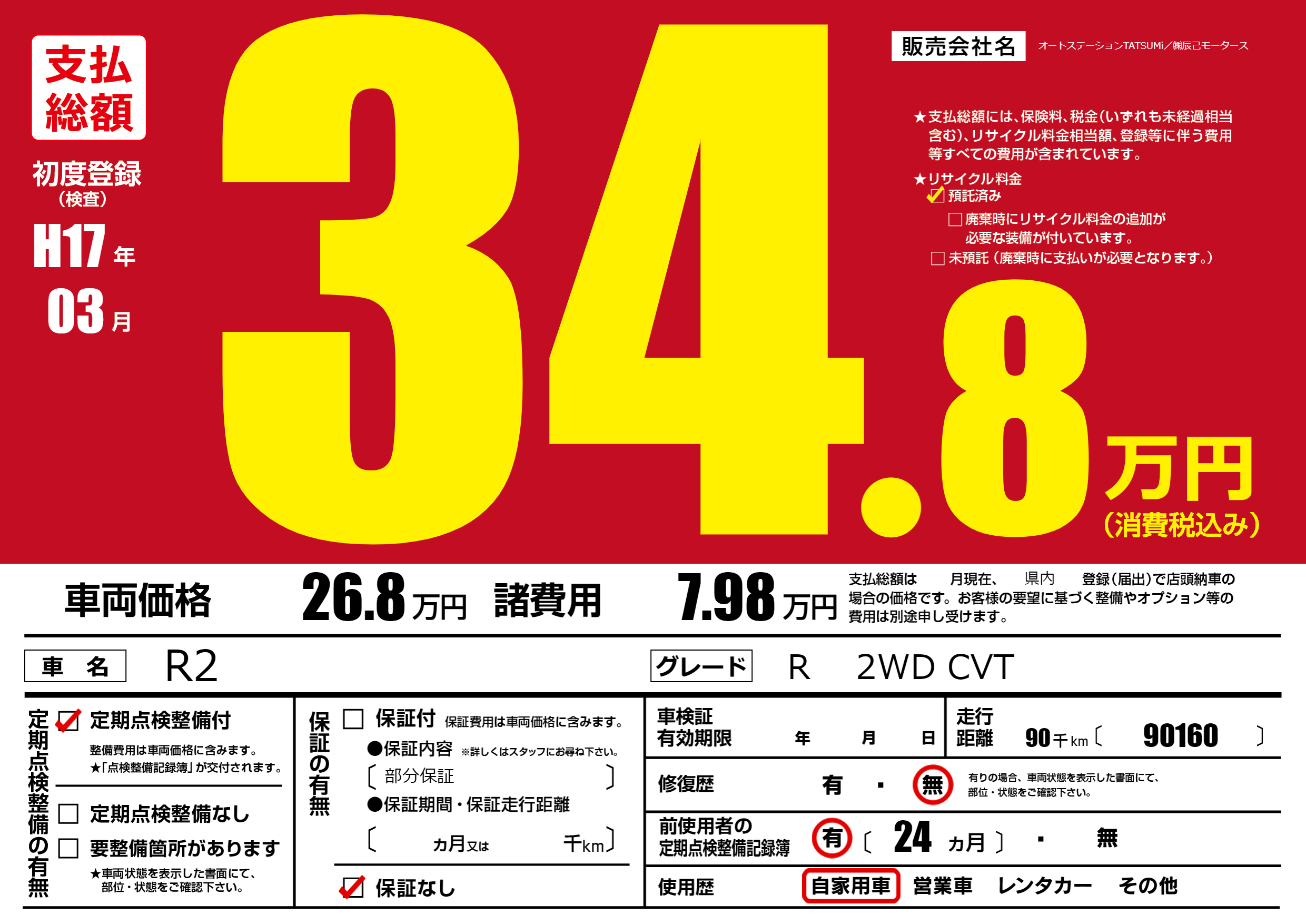 | 走行キロ | 9万km | 初年度登録 | H17年03月 |