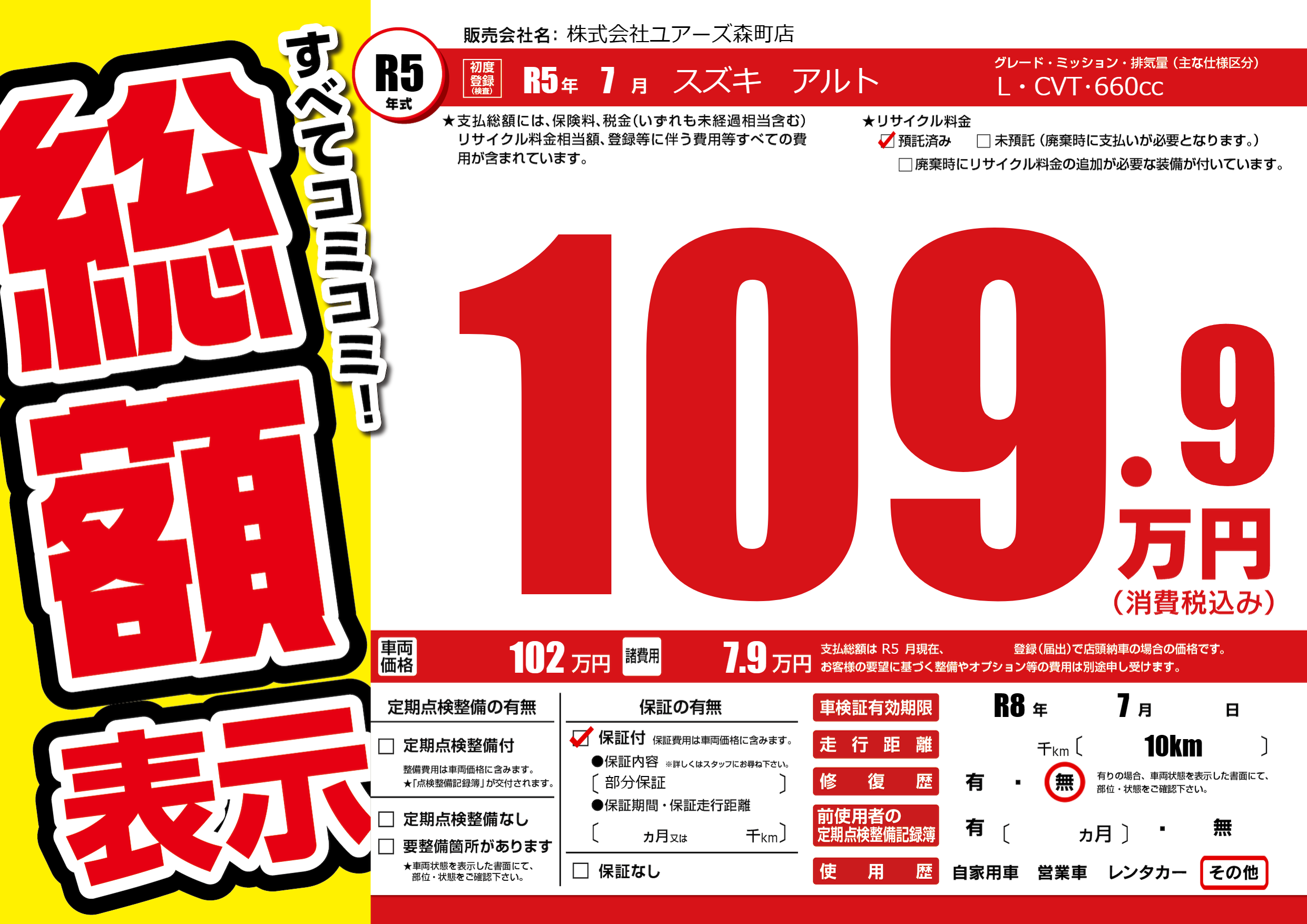 保証なし 保証内容(部分保証) ---ヶ月または()千kmまで |