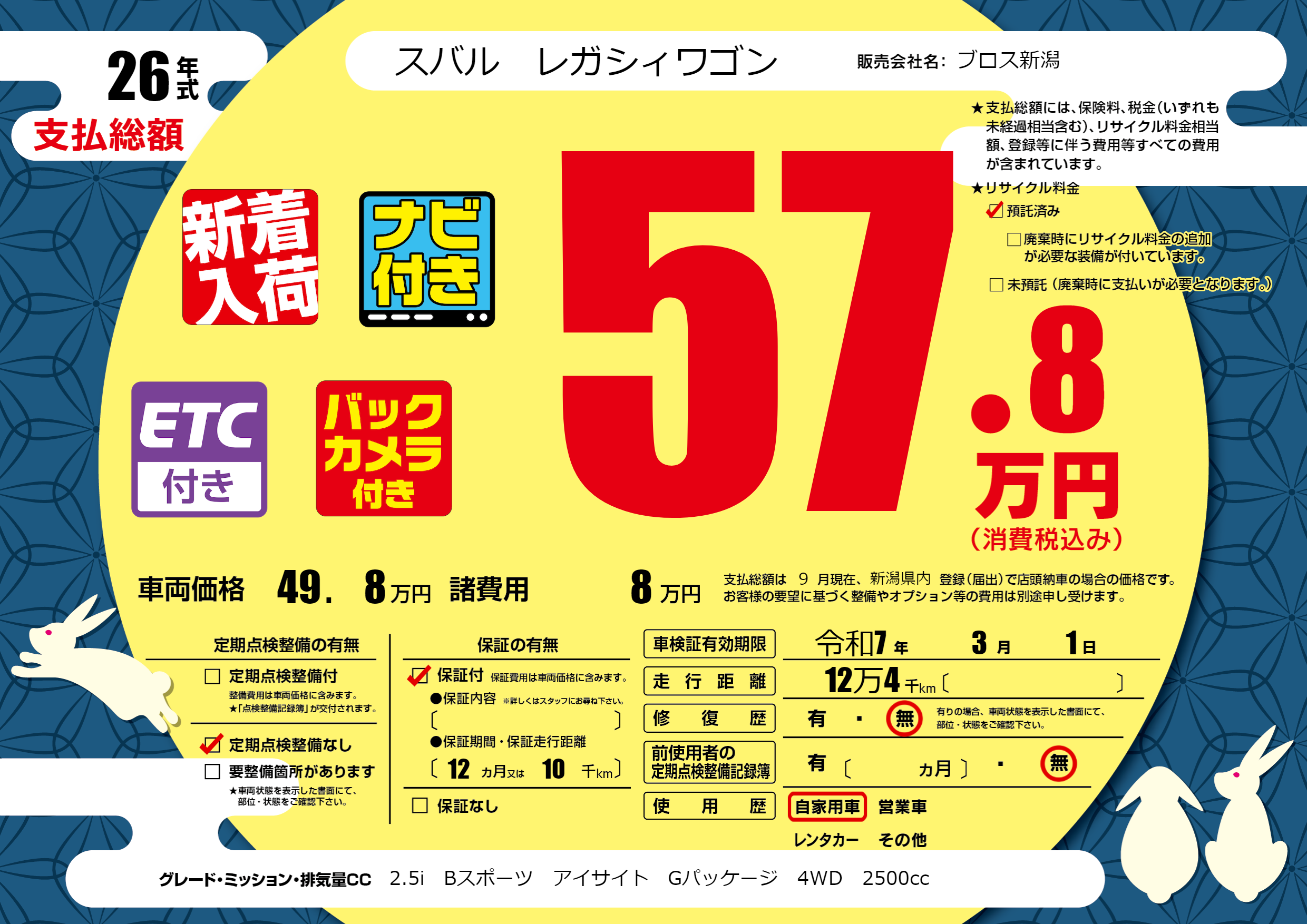 | 車名 | スバル レガシィワゴン | グレード ミッション 排気量 |
