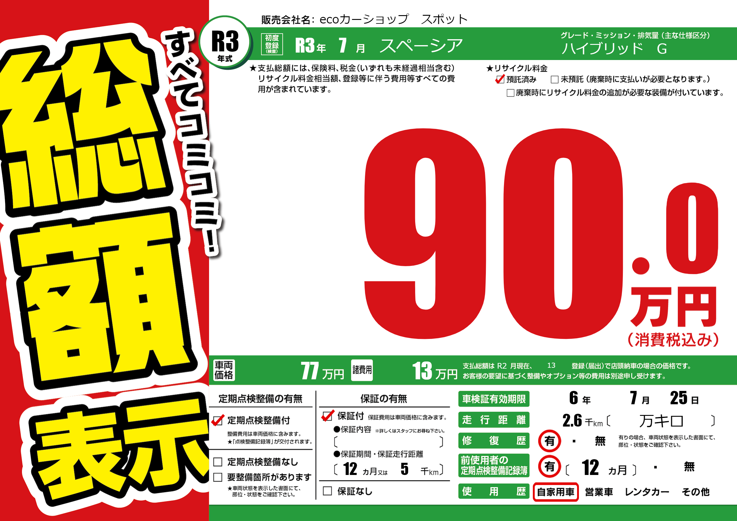 | 車名 | スペーシア | グレード ミッション 排気量 |