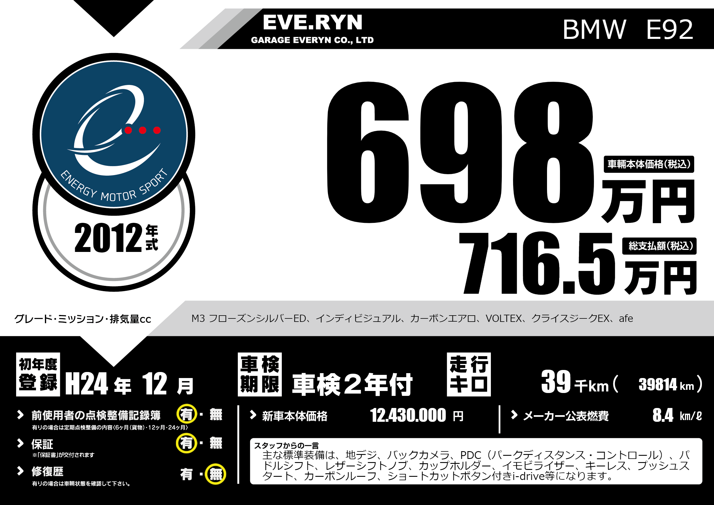 | 車名 | BMW E92 | グレード ミッション 排気量 |
