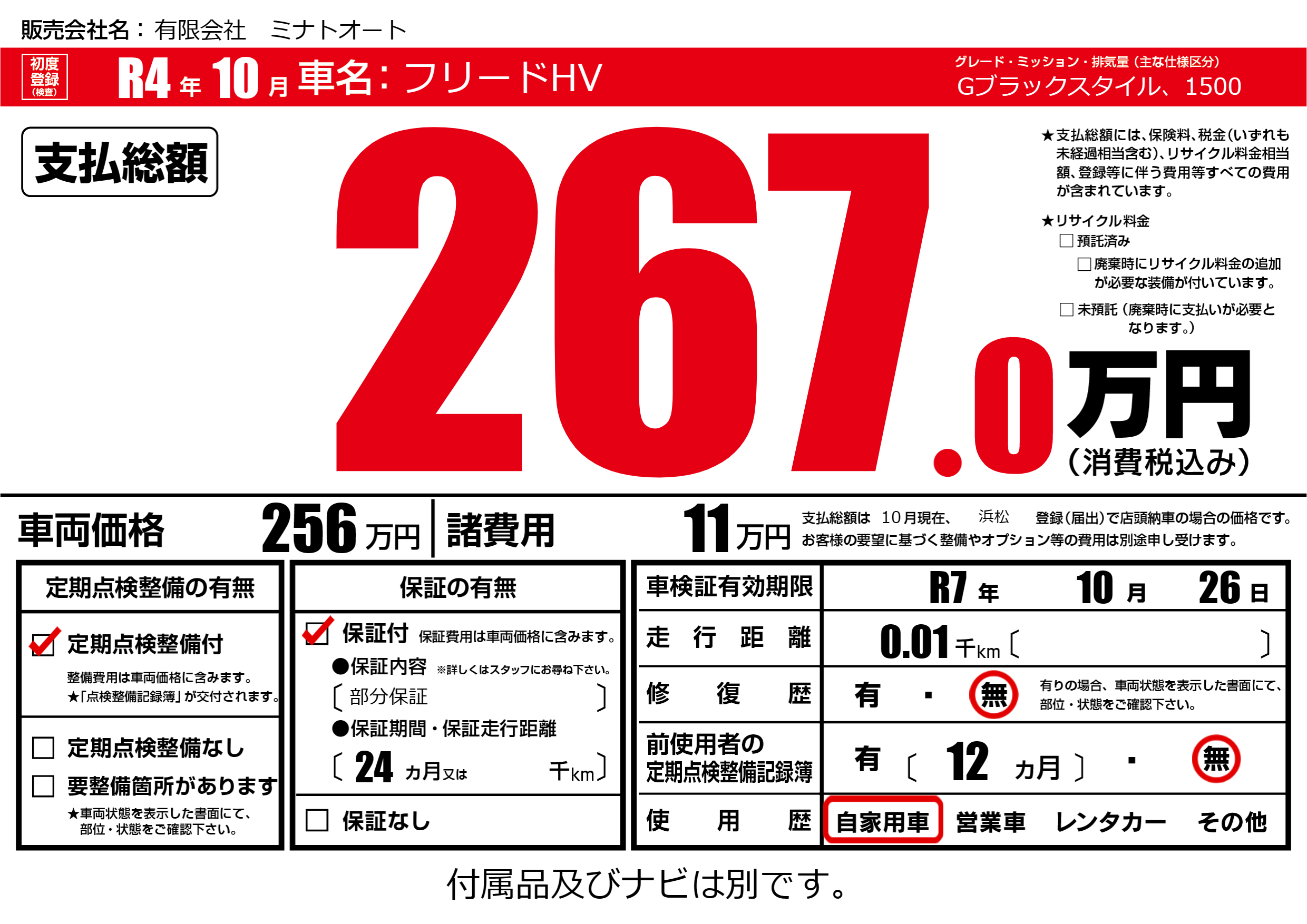 | 車名 | フリードHV | グレード ミッション 排気量 |