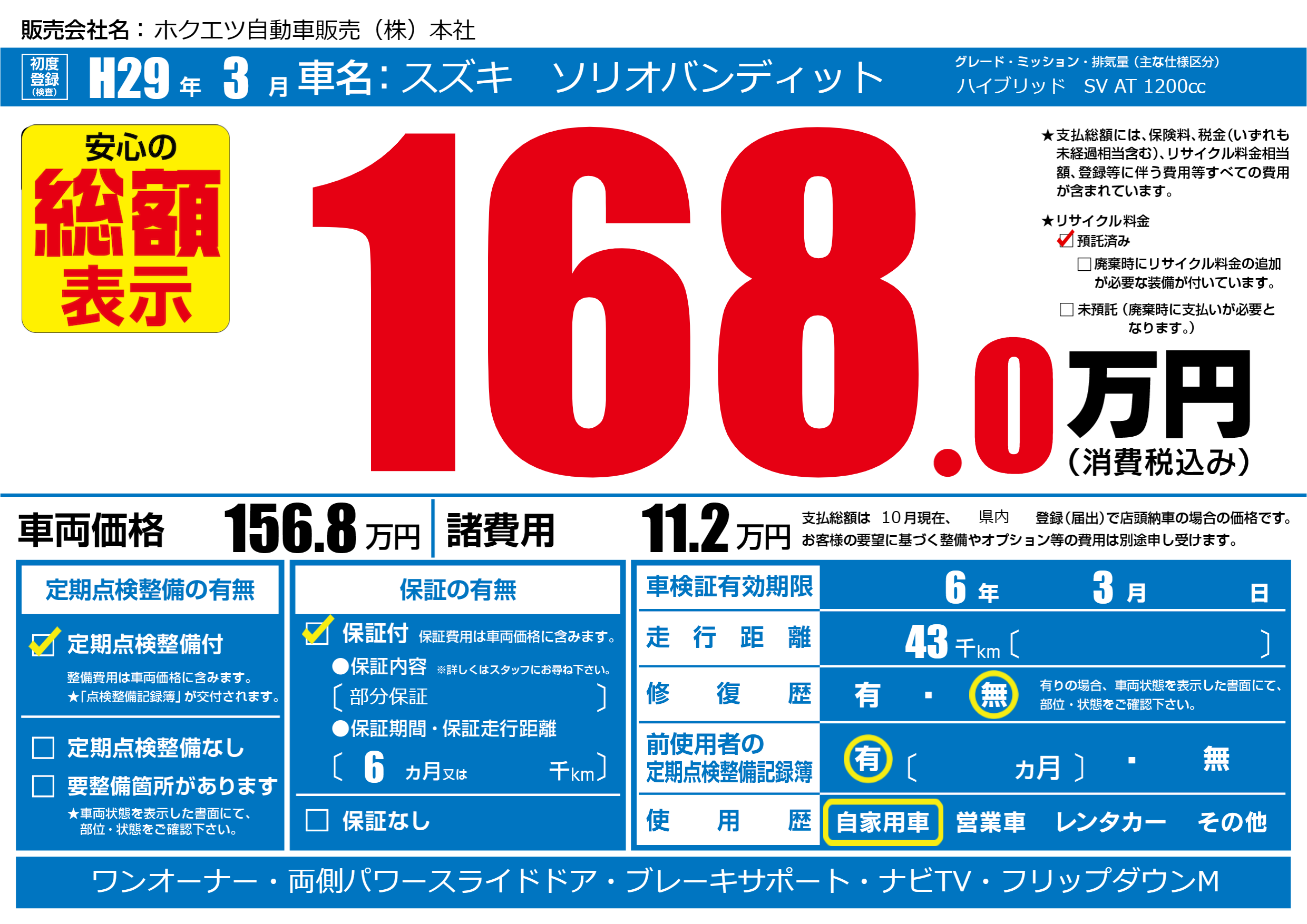 | 車名 | スズキ ソリオバンディット | グレード ミッション 排気量 |