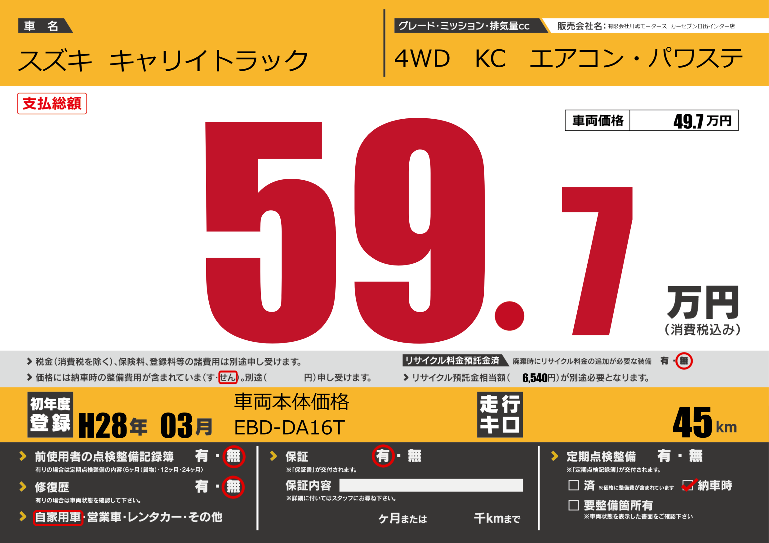 | 走行キロ | 4.5万km | 初年度登録 | H28年03月 |