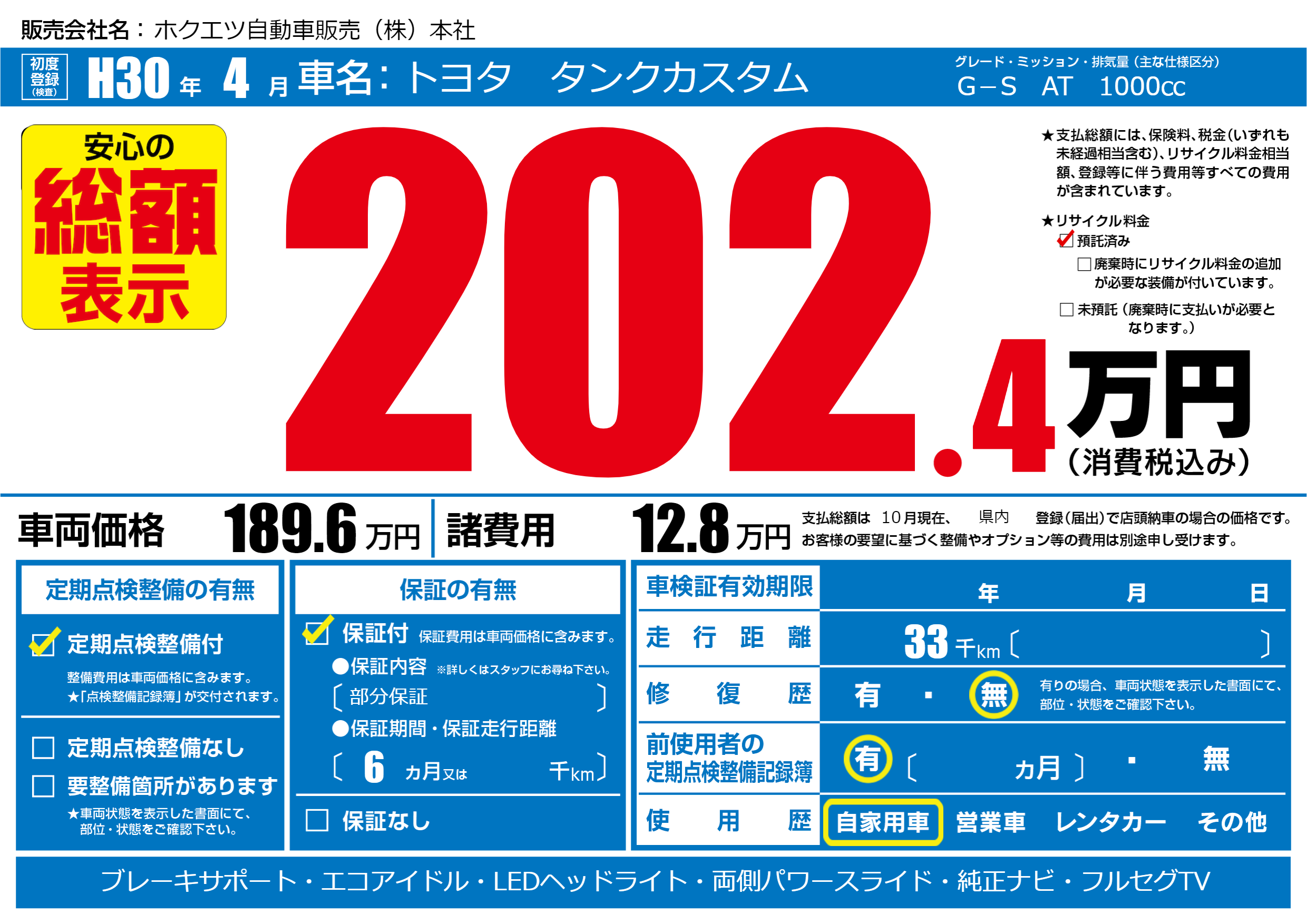 | 走行キロ | 3.3万km | 初年度登録 | H30年4月 |