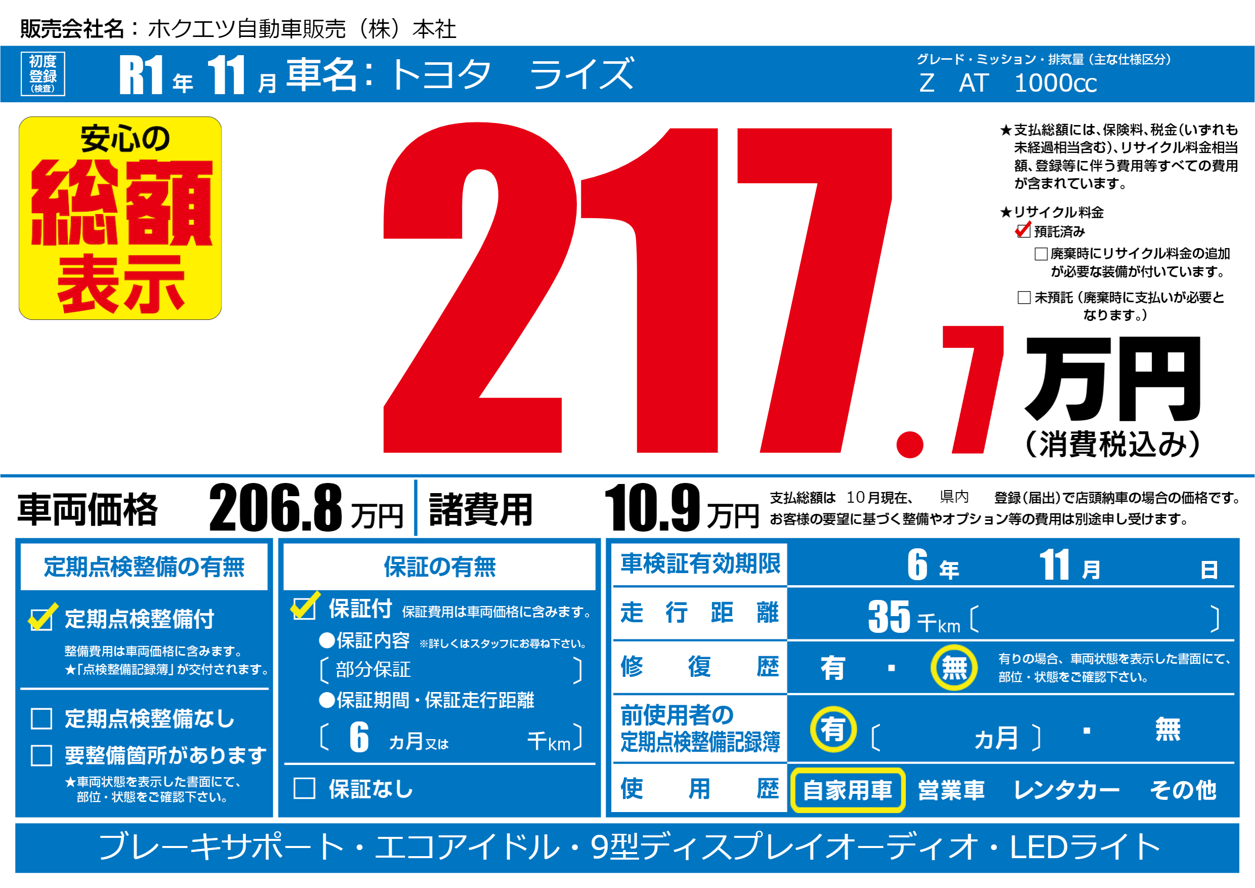 | 車名 | トヨタ ライズ | グレード ミッション 排気量 |