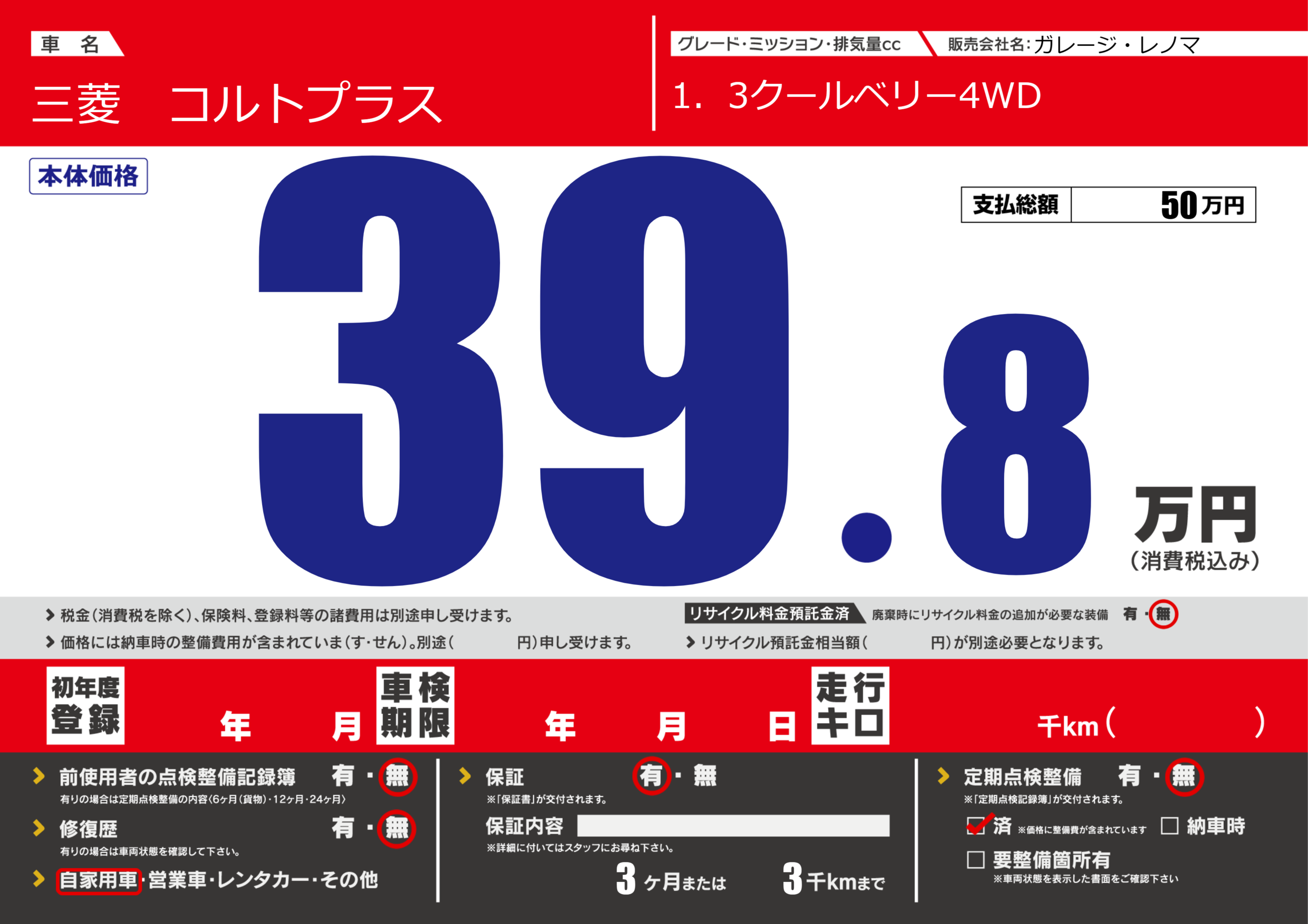 保証付き 保証内容(---) 3ヶ月または(3)千kmまで |