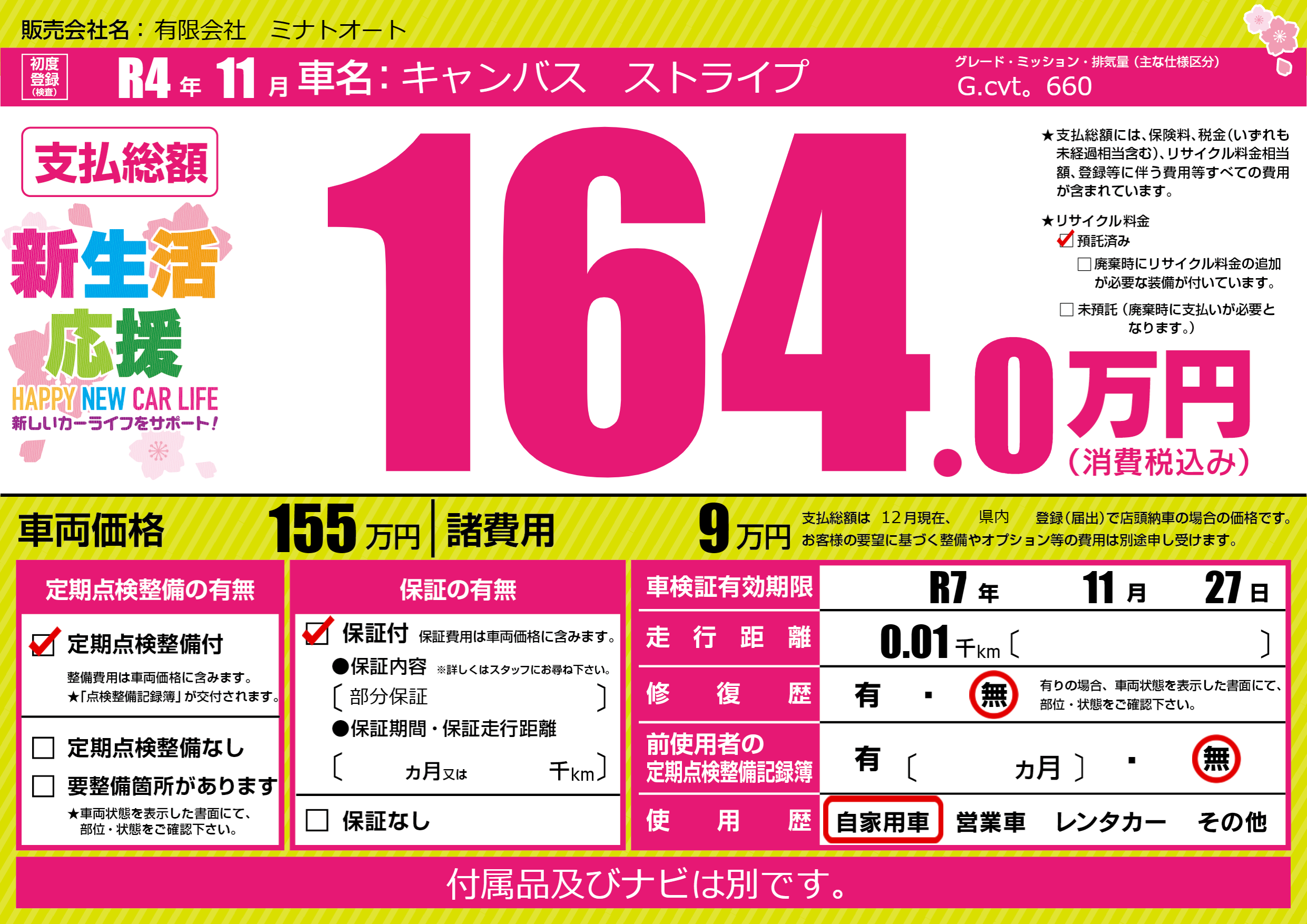 | 車名 | キャンバス ストライプ | グレード ミッション 排気量 |