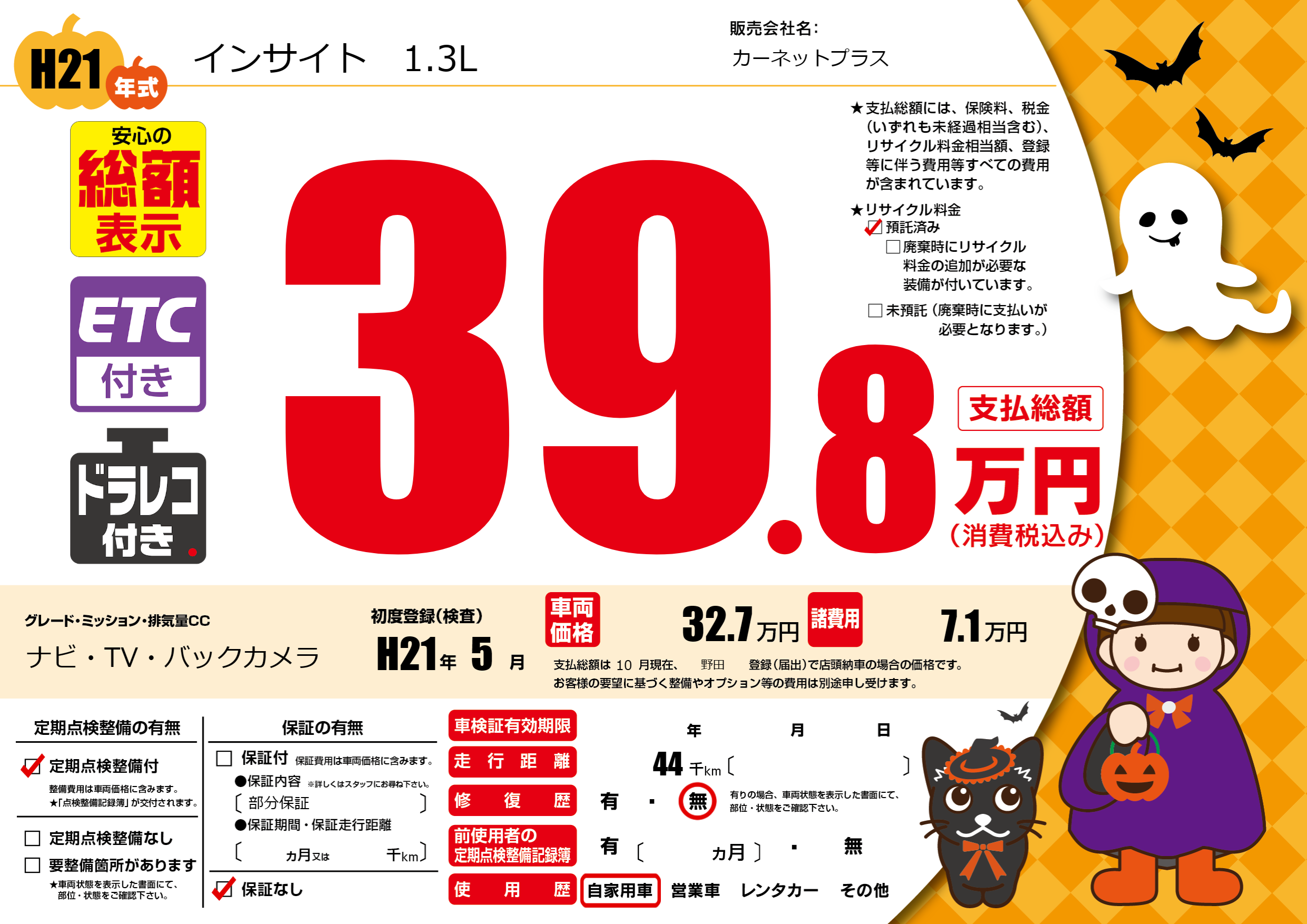 | 車名 | インサイト 1.3L | グレード ミッション 排気量 |