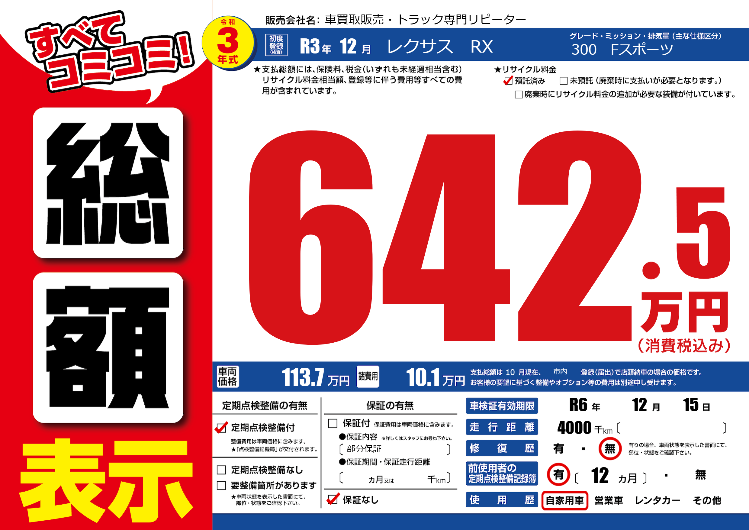 | 車名 | レクサス RX | グレード ミッション 排気量 |