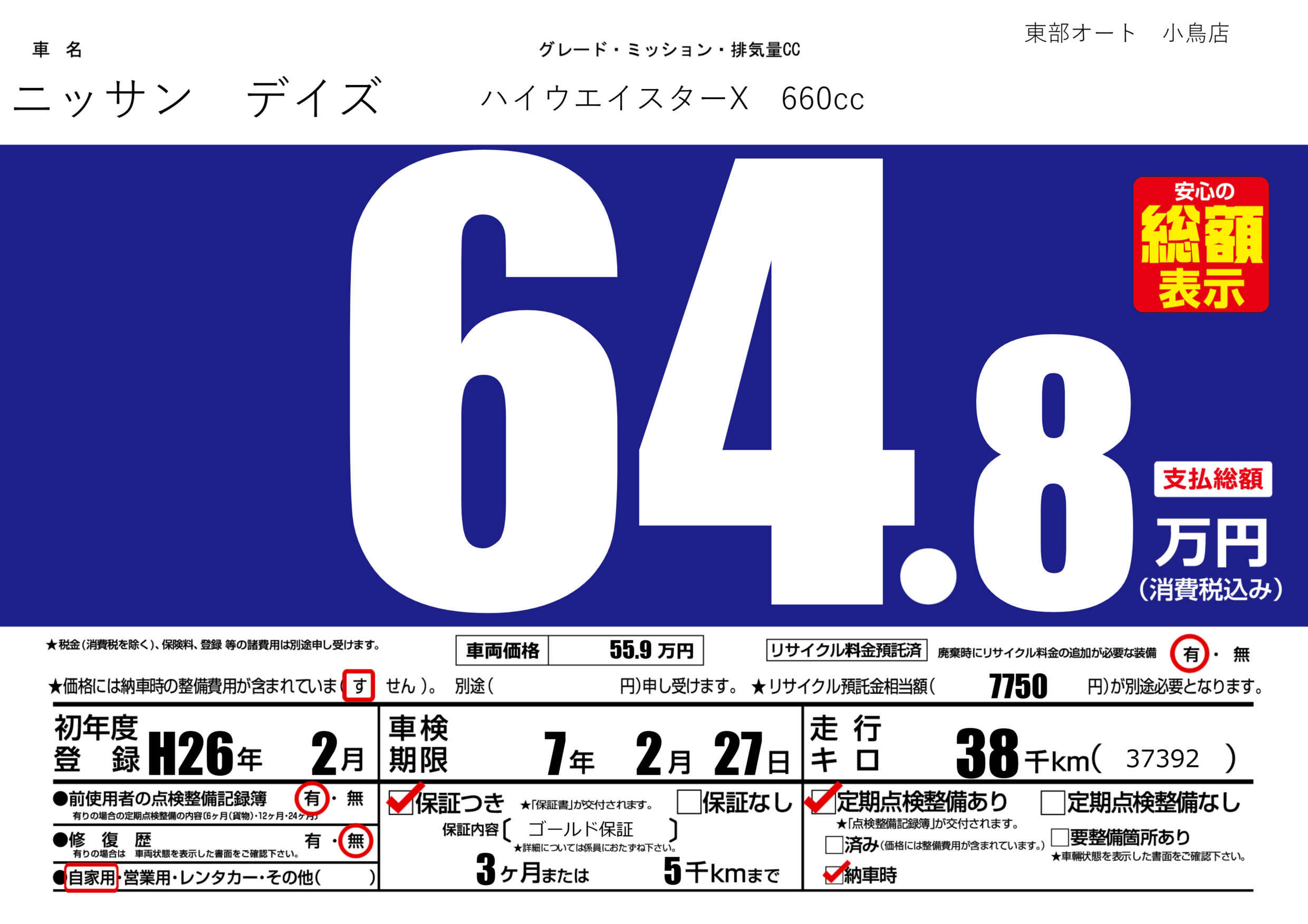 | 走行キロ | 3.8万km | 初年度登録 | H26年2月 |