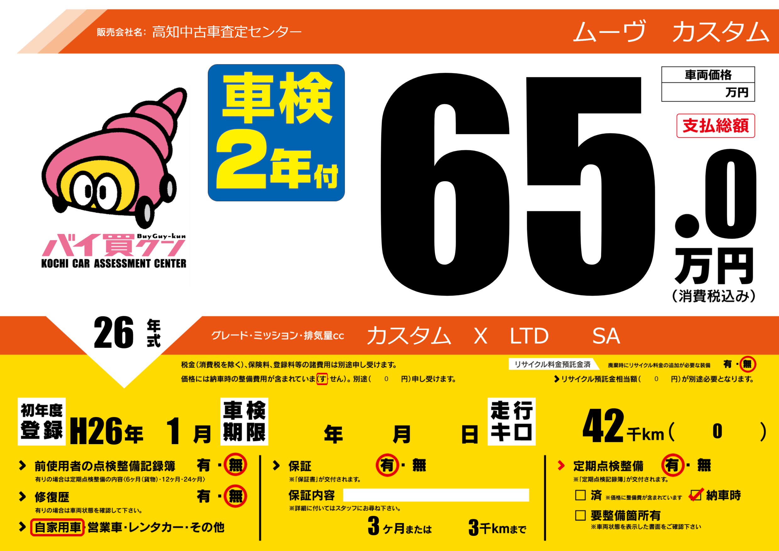 | 走行キロ | 4.2万km | 初年度登録 | H26年1月 |