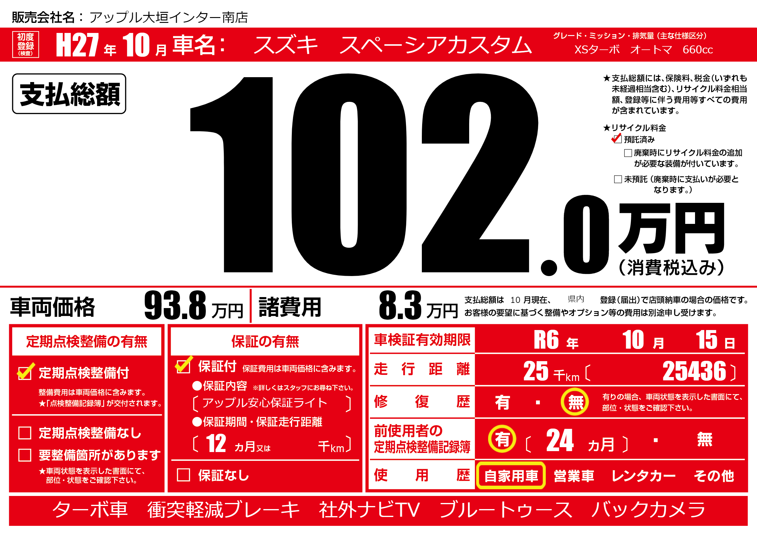 | 車名 | スズキ スペーシアカスタム | グレード ミッション 排気量 |