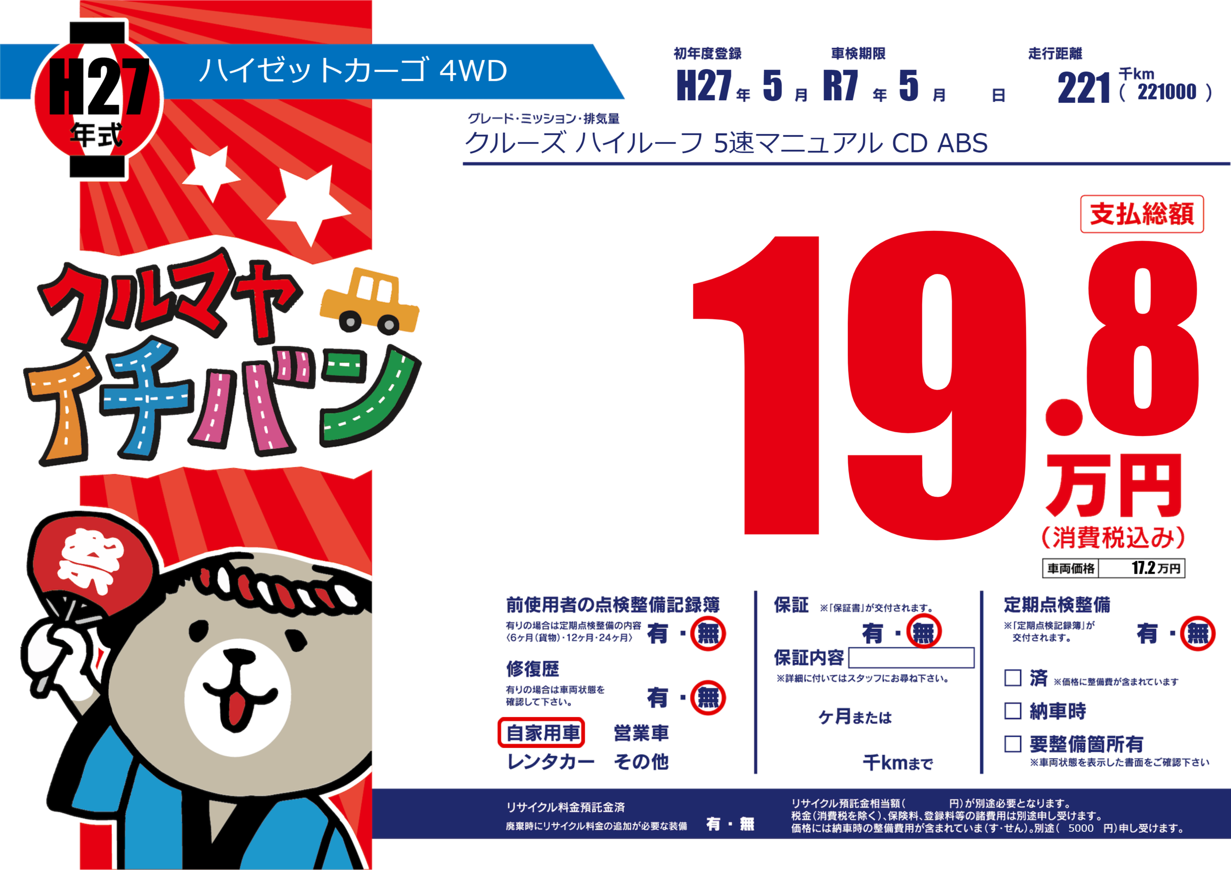 | 車名 | ハイゼットカーゴ 4WD | グレード ミッション 排気量 |