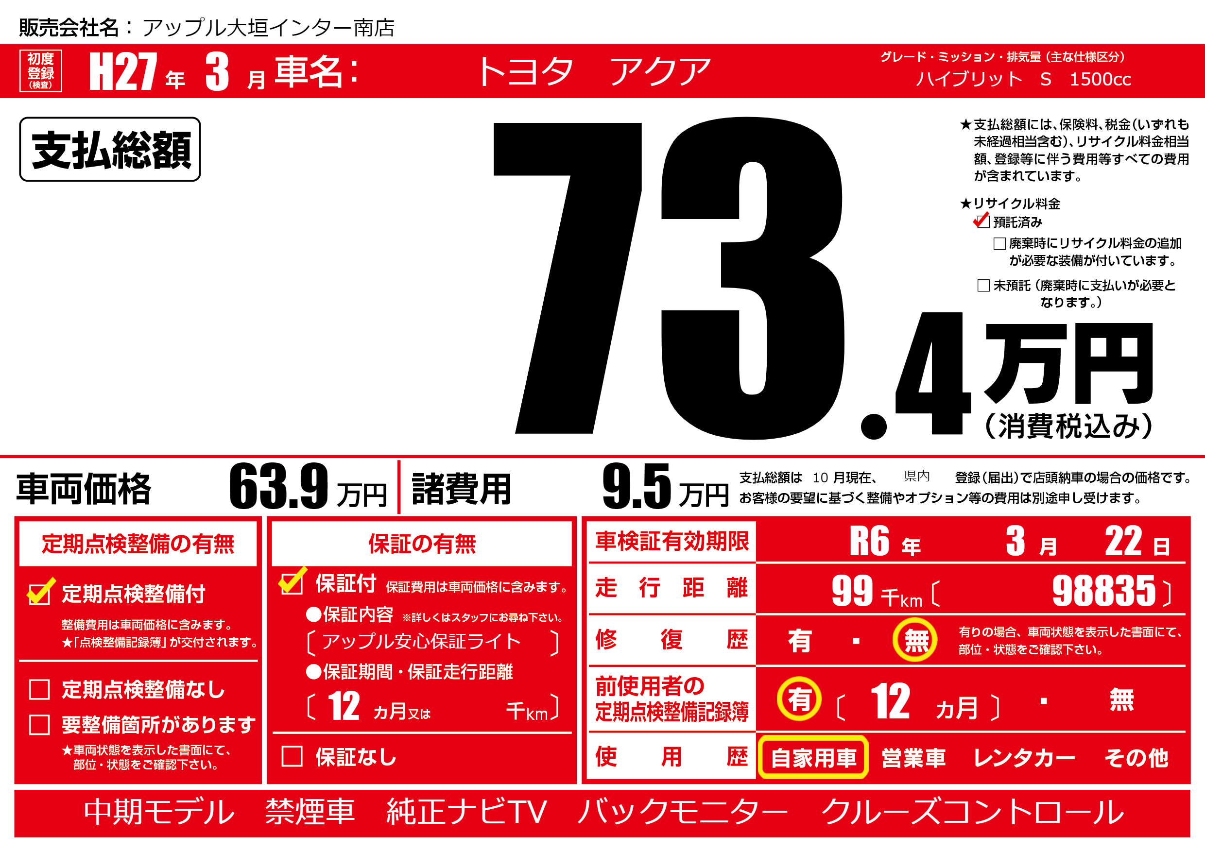 | 車名 | トヨタ アクア | グレード ミッション 排気量 |