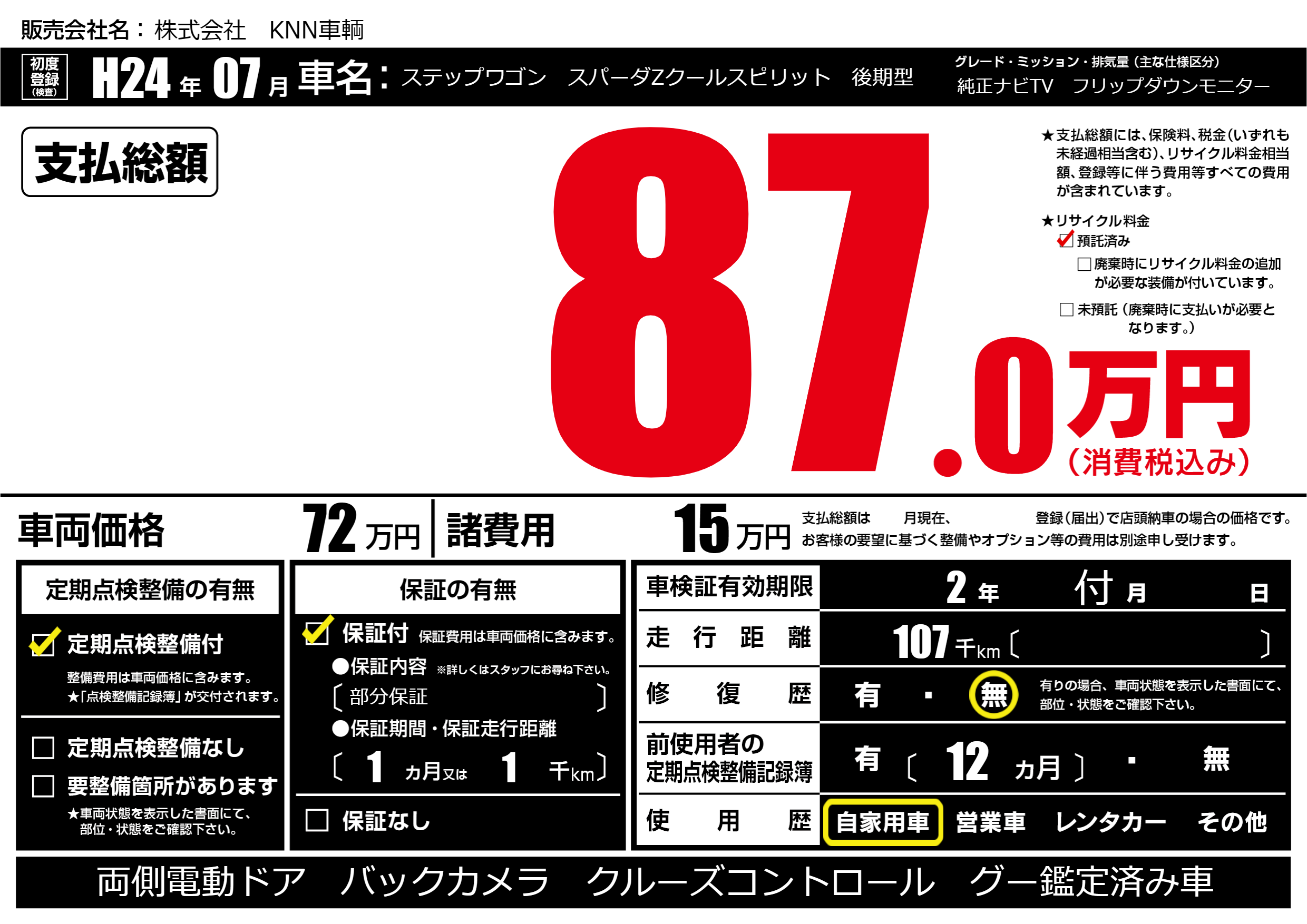 | 走行キロ | 10.7万km | 初年度登録 | H24年07月 |