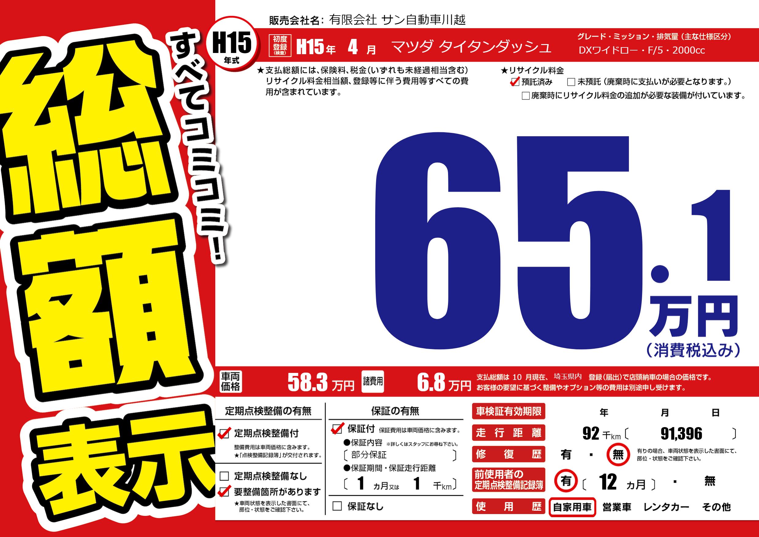 | 走行キロ | 9.2万km | 初年度登録 | H15年4月 |