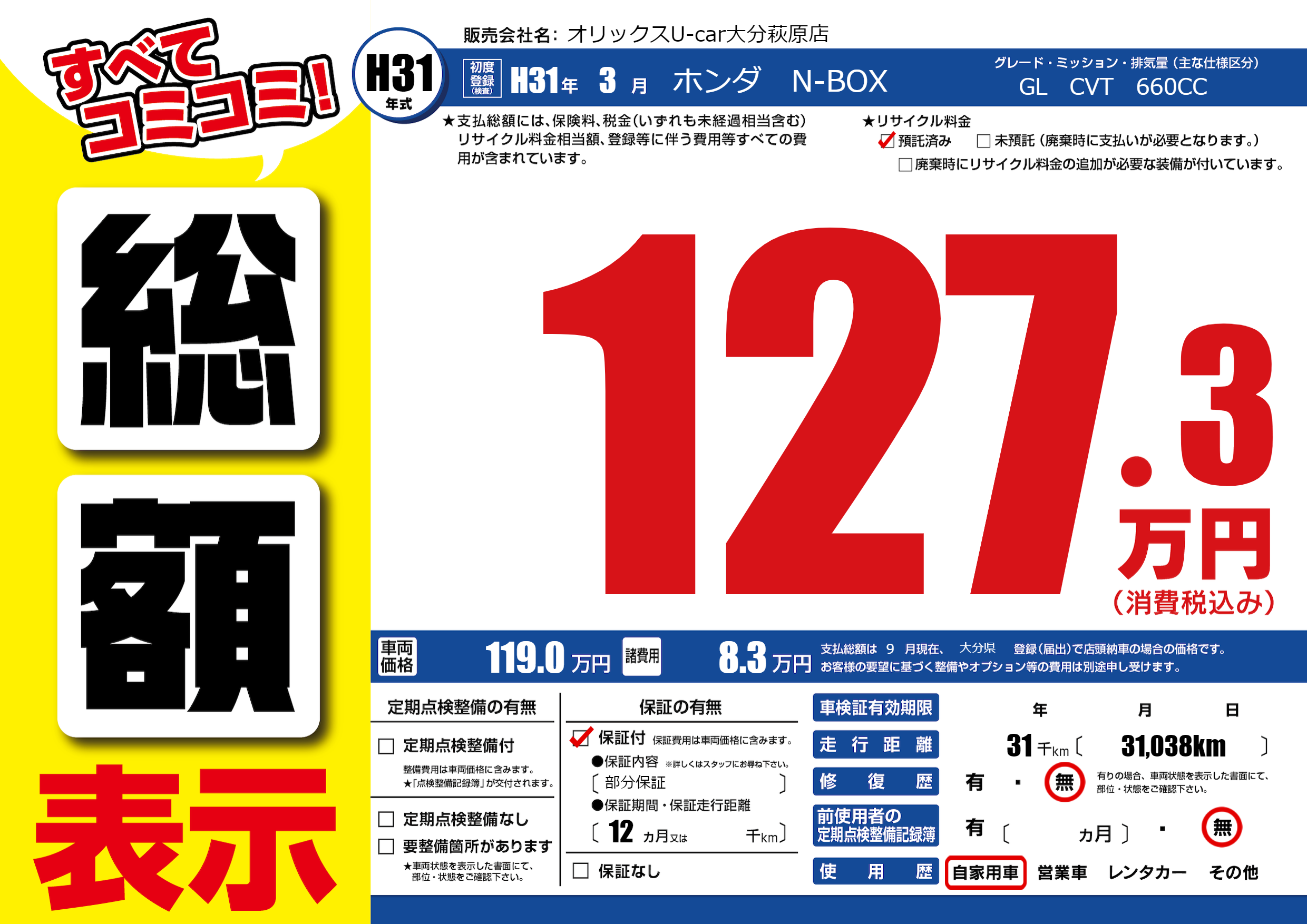 | 走行キロ | 3.1万km | 初年度登録 | H31年3月 |