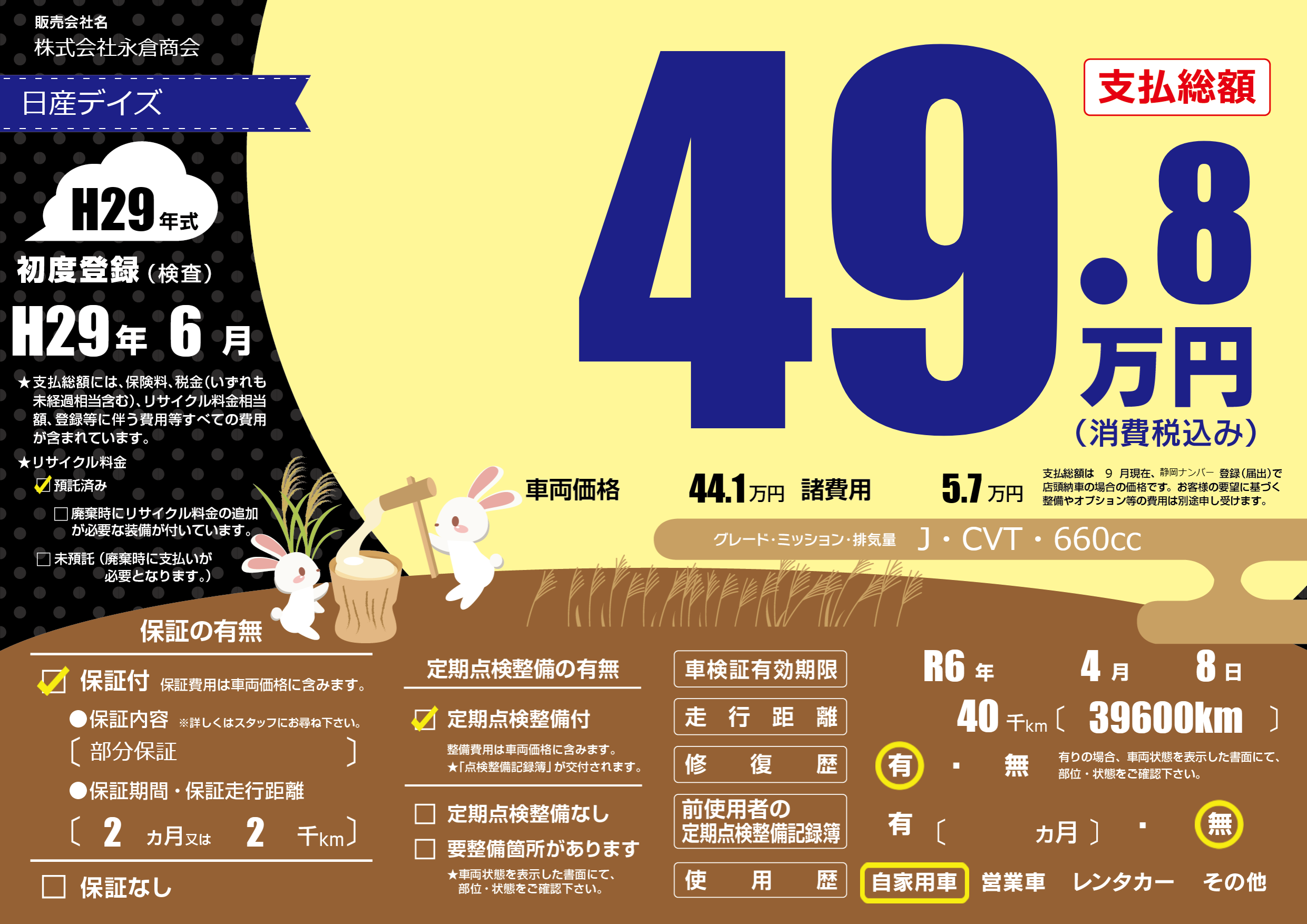 | 走行キロ | 4万km | 初年度登録 | H29年6月 |