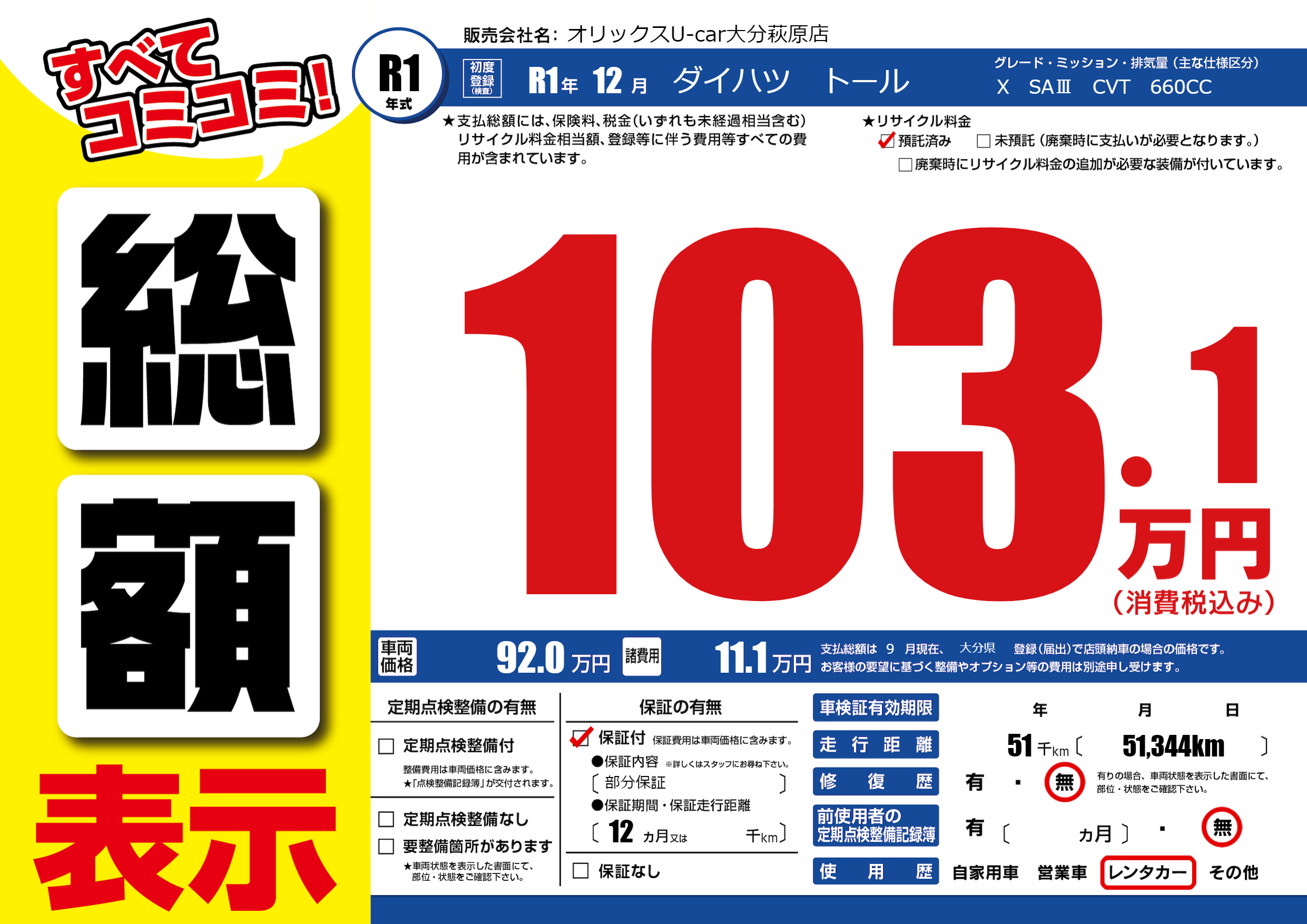 | 走行キロ | 5.1万km | 初年度登録 | R1年12月 |