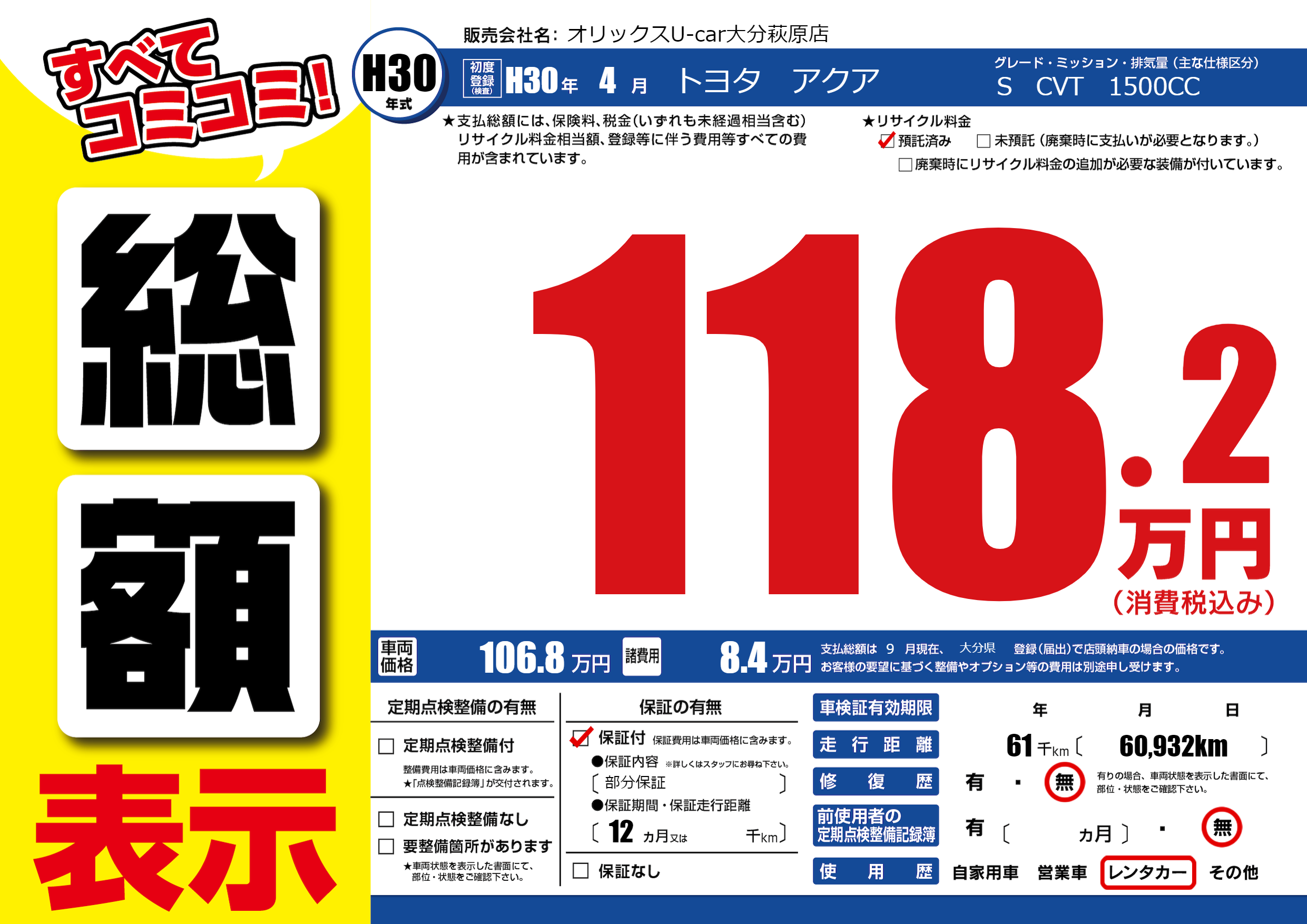 | 車名 | トヨタ アクア | グレード ミッション 排気量 |