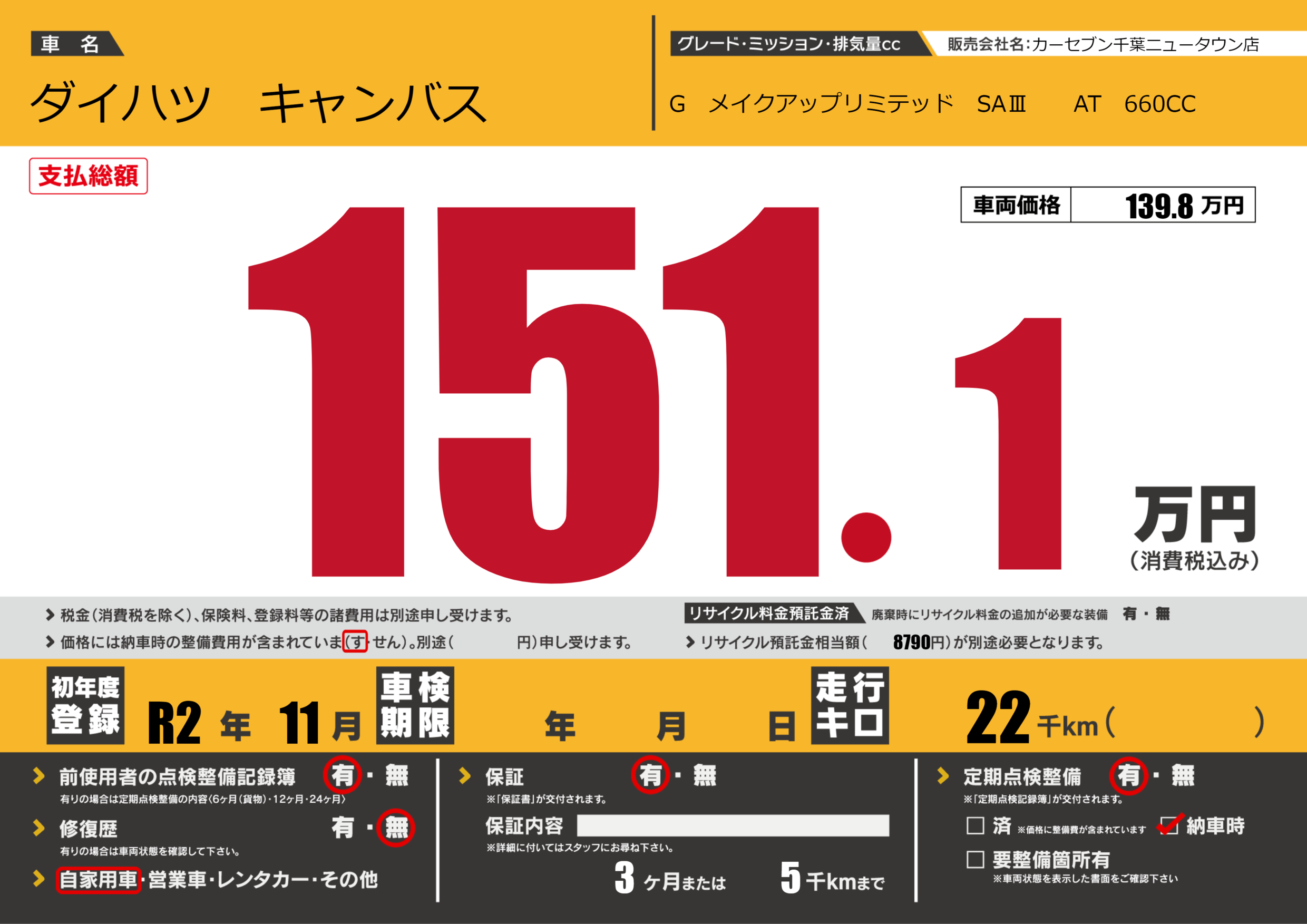 | 定期点検整備 | 定期点検整備あり 納車時あり | ||