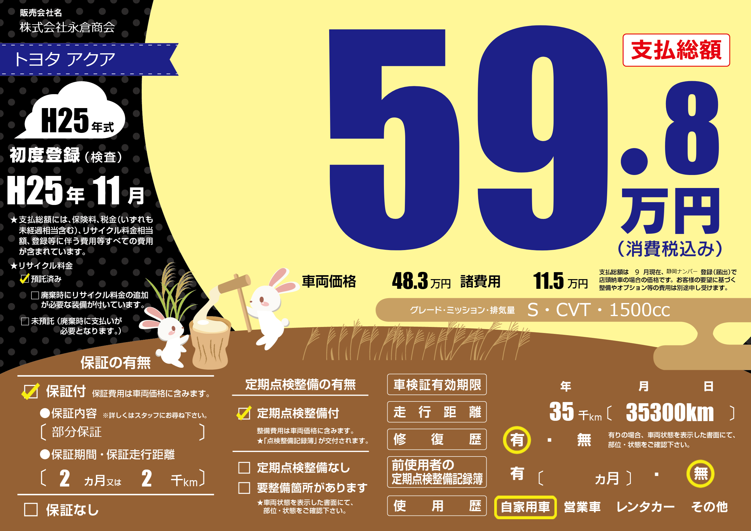 | 走行キロ | 3.5万km | 初年度登録 | H25年11月 |