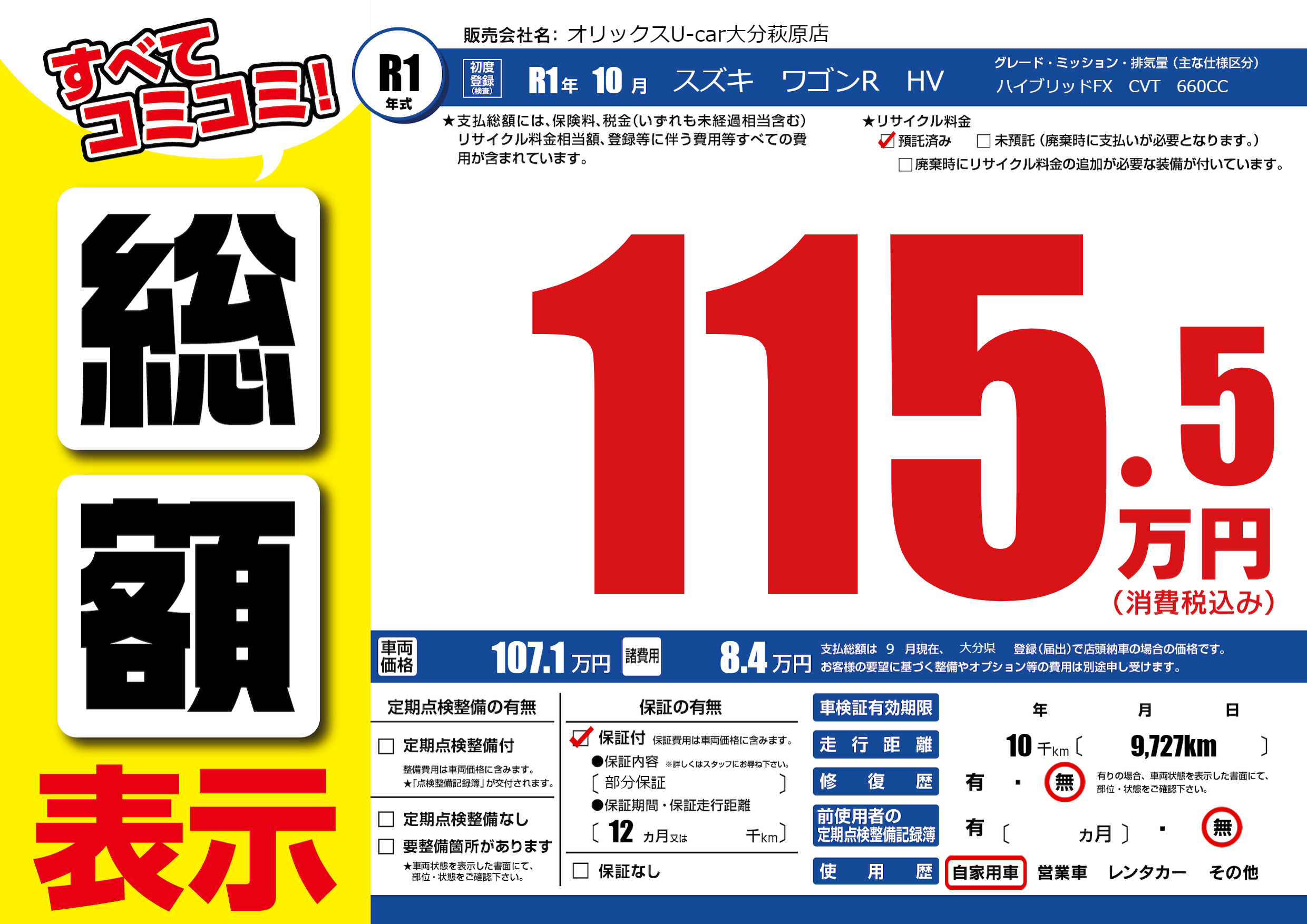 | 車名 | スズキ ワゴンR HV | グレード ミッション 排気量 |