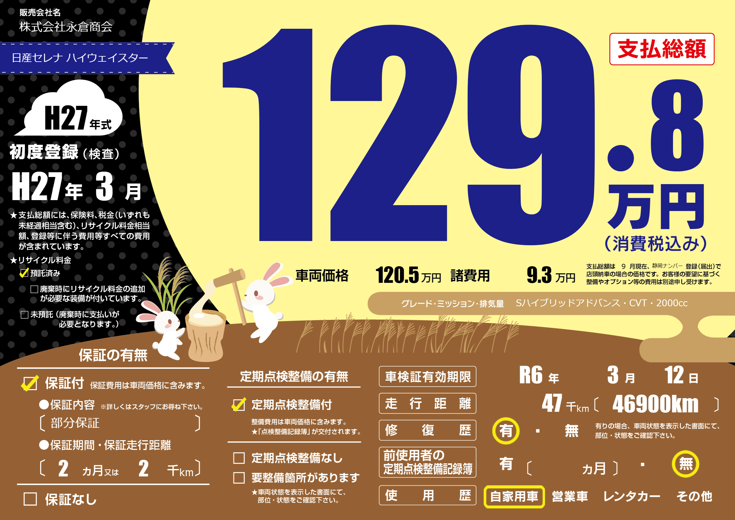 | 走行キロ | 4.7万km | 初年度登録 | H27年3月 |
