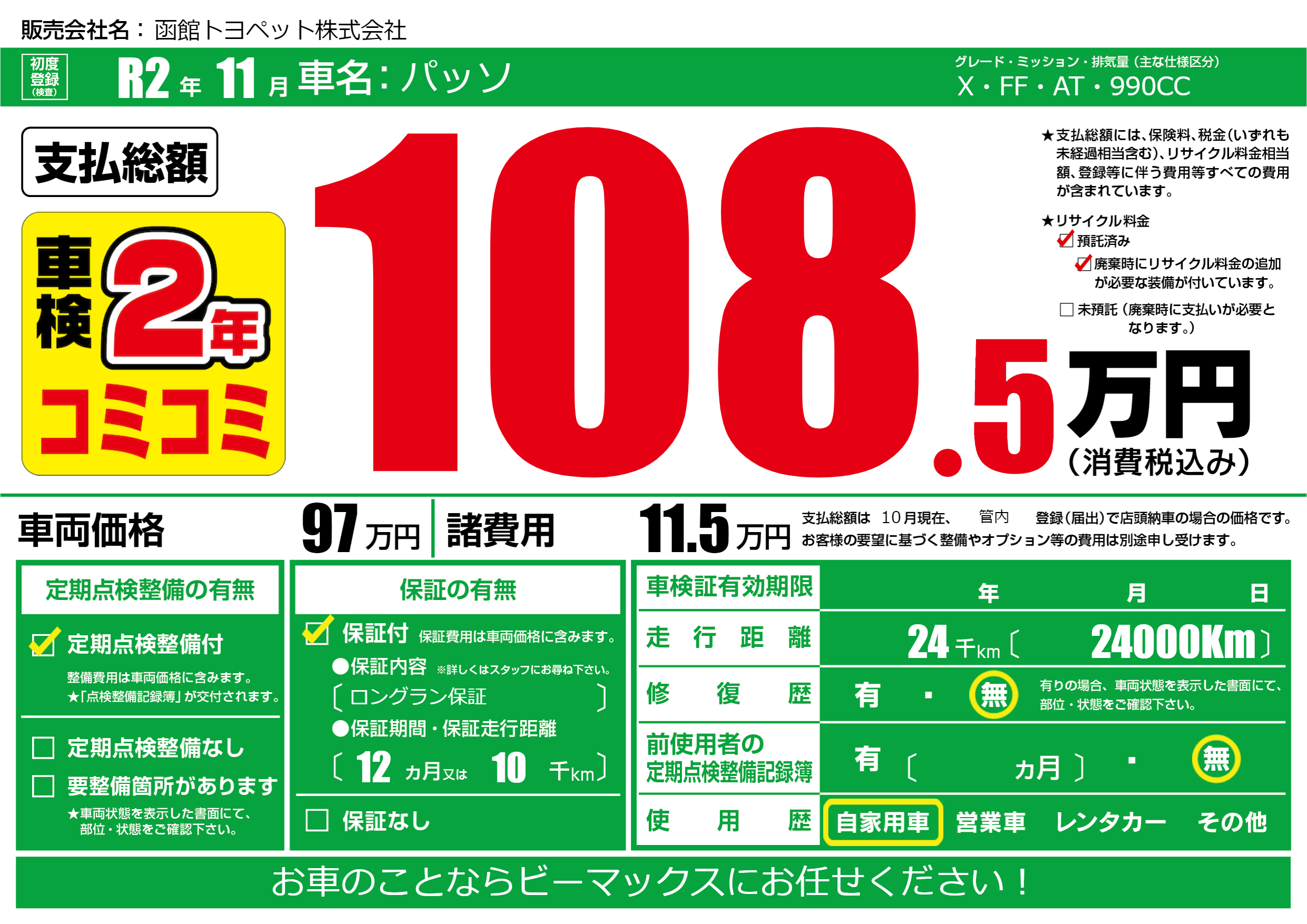 | 車名 | パッソ | グレード ミッション 排気量 |