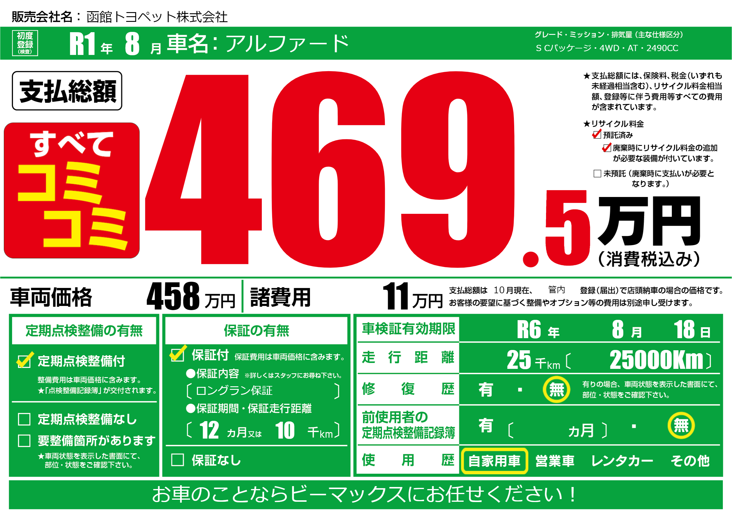| 車名 | アルファード | グレード ミッション 排気量 |