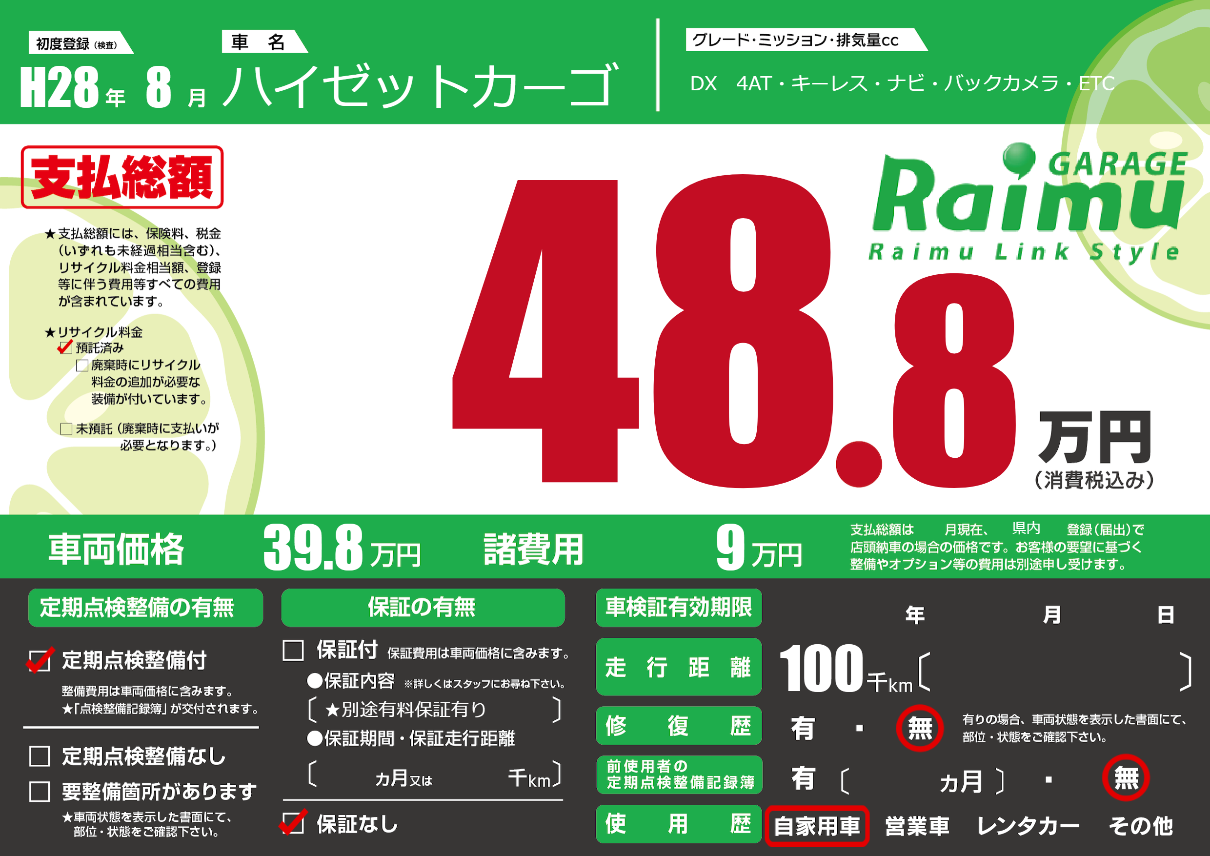 保証なし 保証内容(★別途有料保証有り) ---ヶ月または()千kmまで |