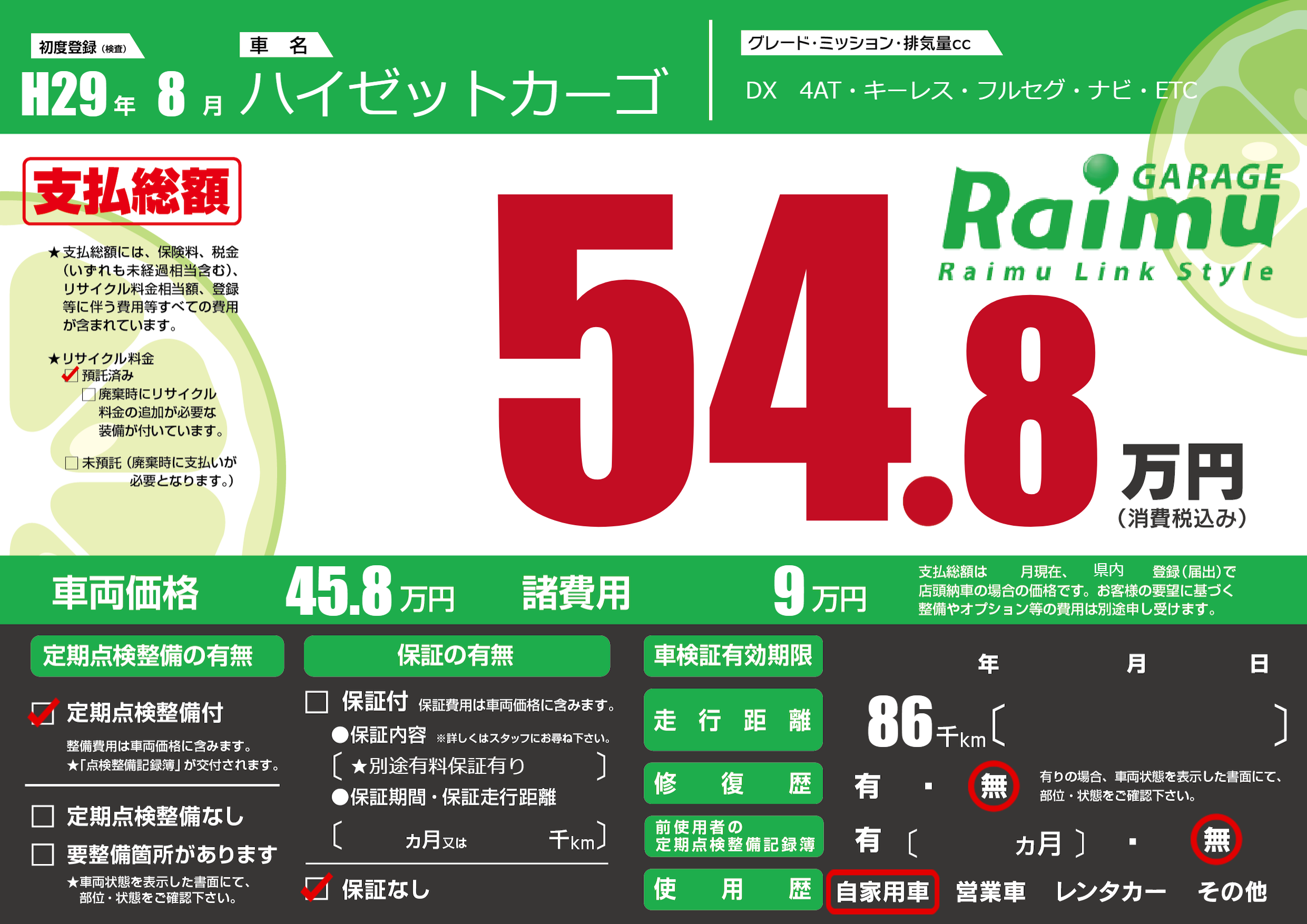 保証なし 保証内容(★別途有料保証有り) ---ヶ月または()千kmまで |
