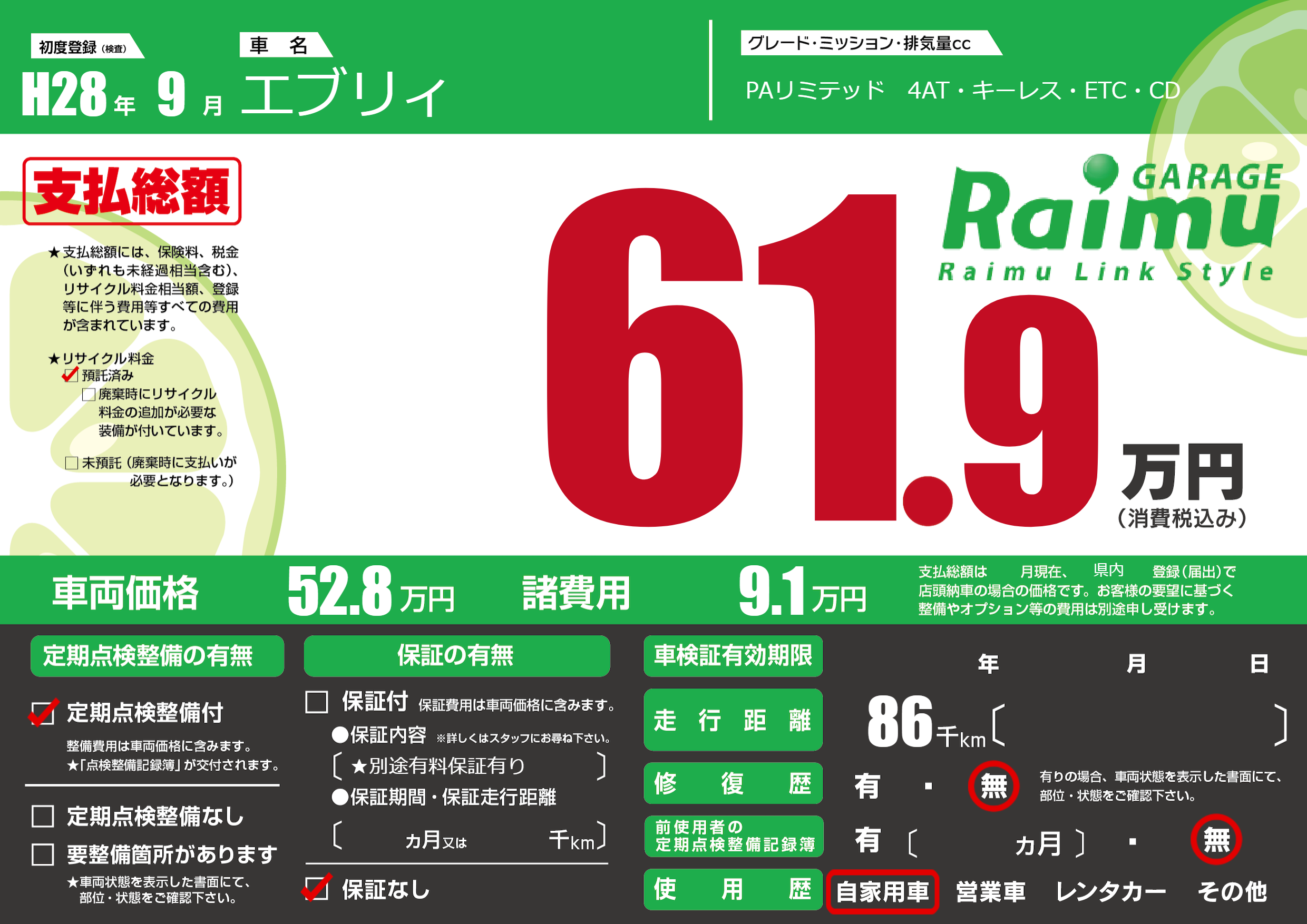 保証なし 保証内容(★別途有料保証有り) ---ヶ月または()千kmまで |