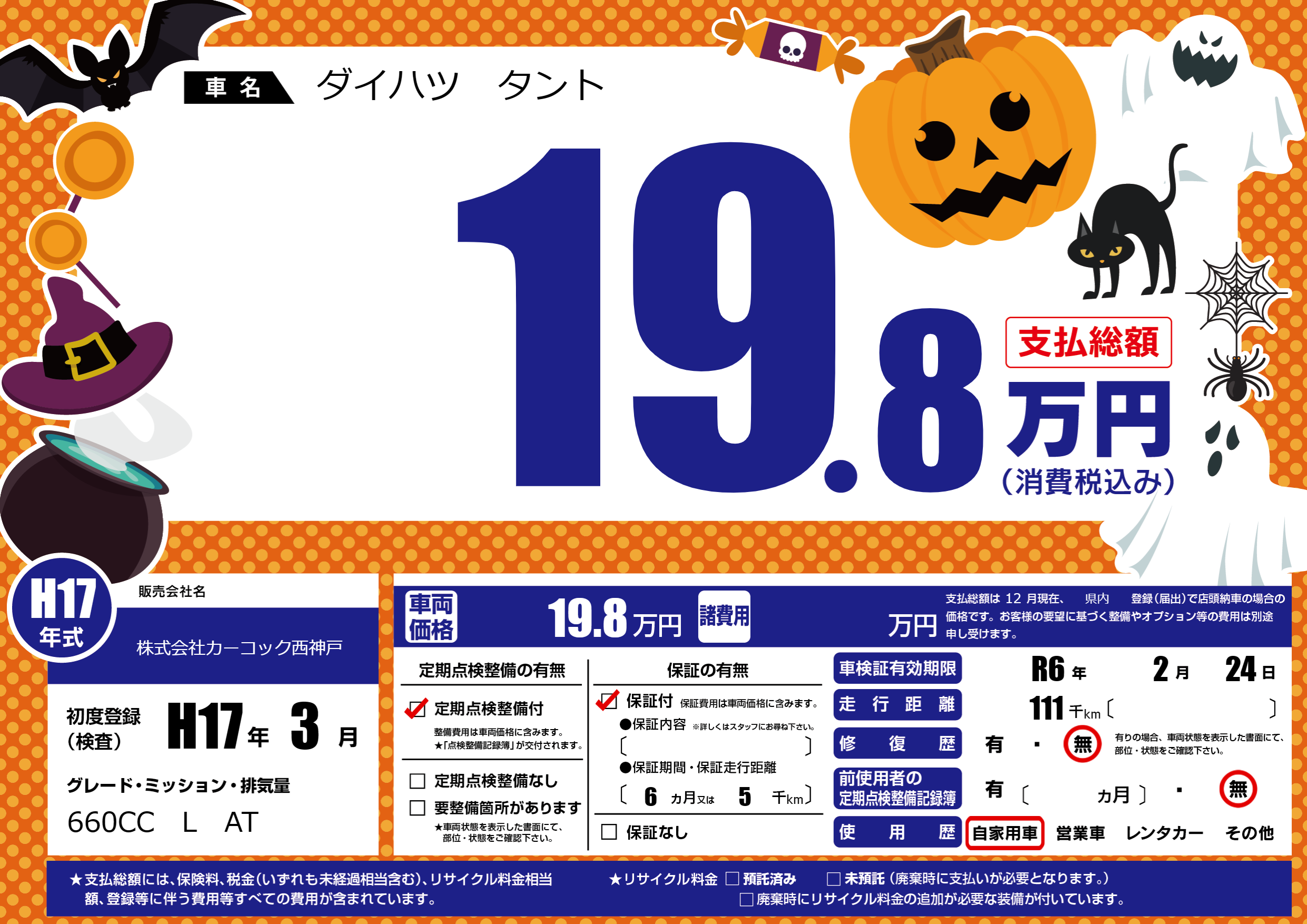 | 車名 | ダイハツ タント | グレード ミッション 排気量 |