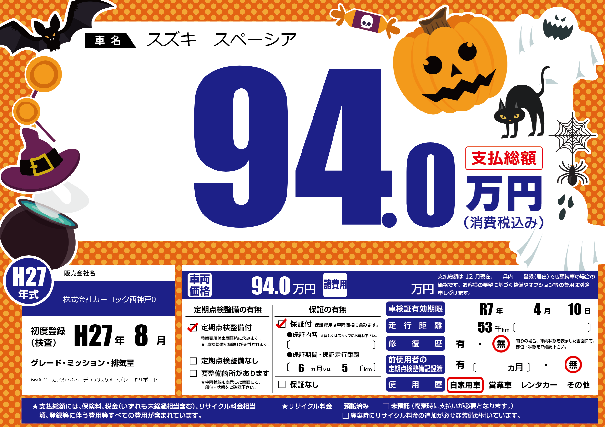 | 走行キロ | 5.3万km | 初年度登録 | H27年8月 |