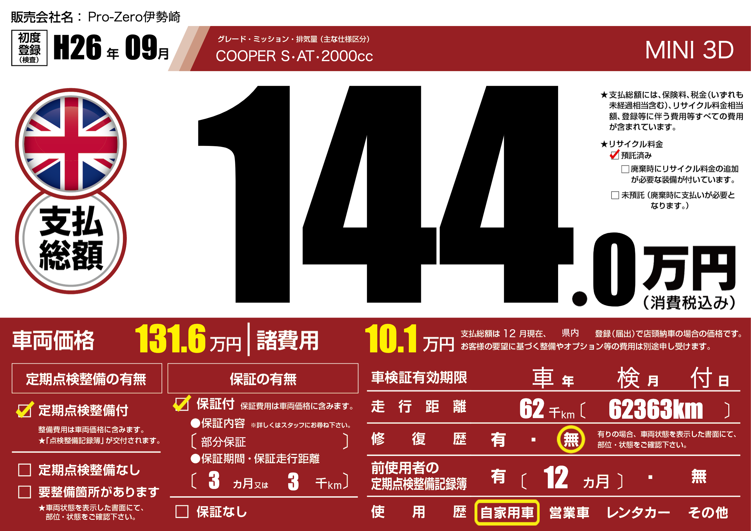 | 車名 | MINI 3D | グレード ミッション 排気量 |