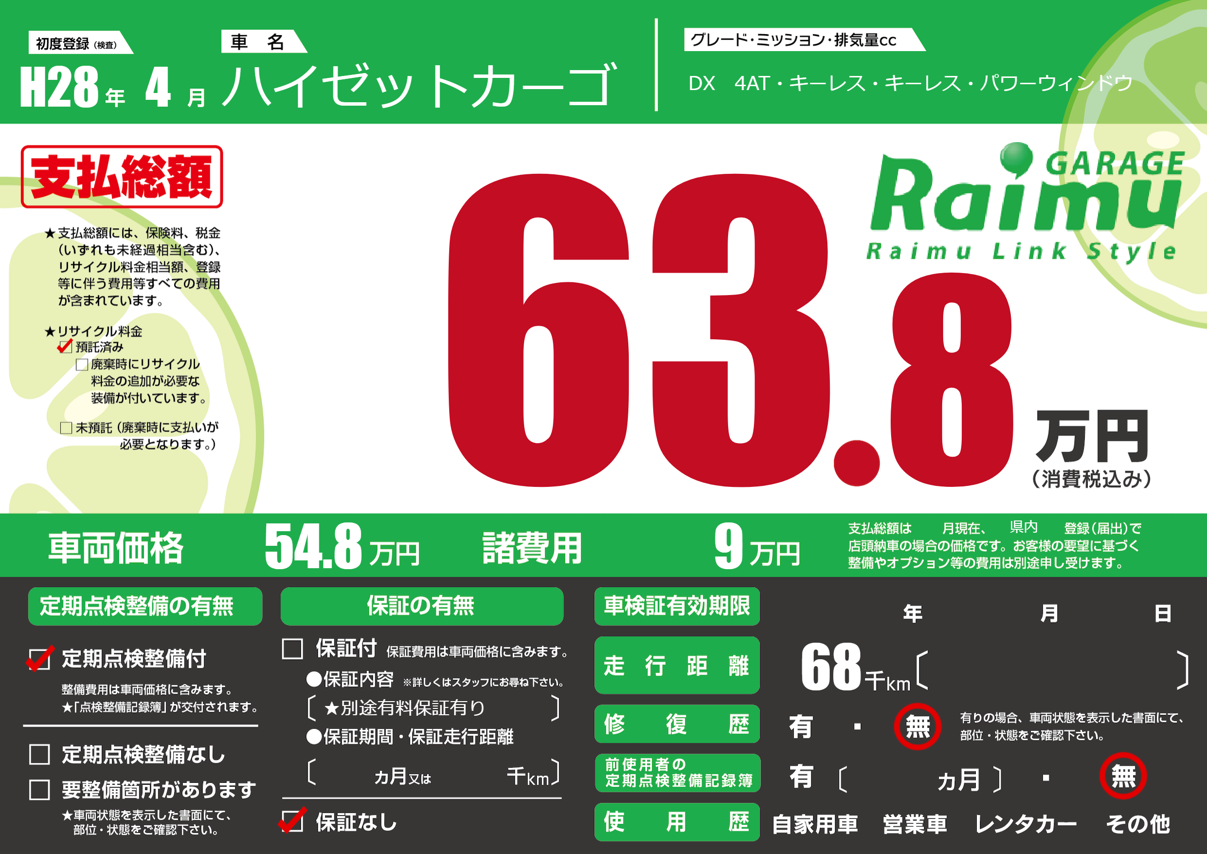 保証なし 保証内容(★別途有料保証有り) ---ヶ月または()千kmまで |