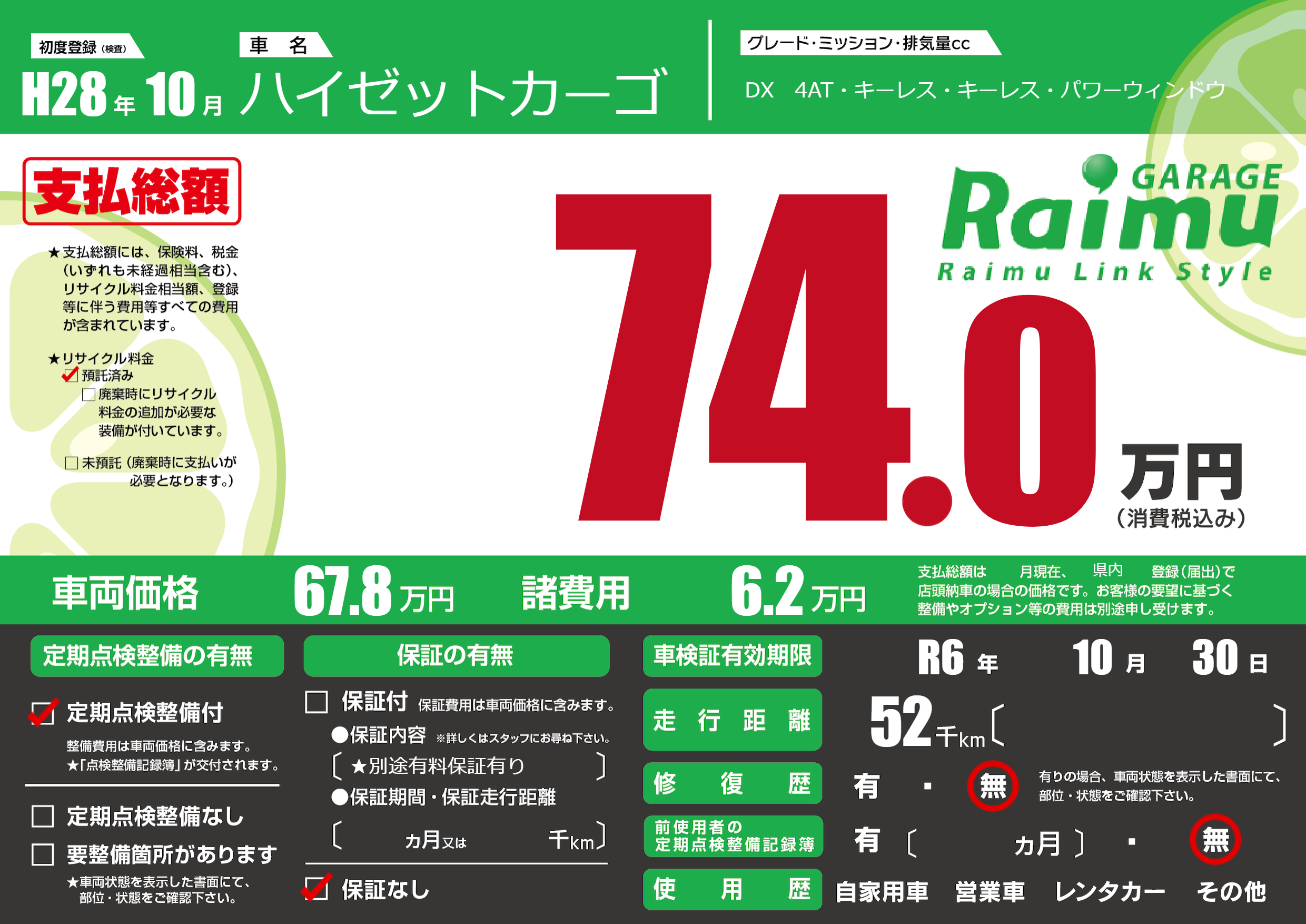 保証なし 保証内容(★別途有料保証有り) ---ヶ月または()千kmまで |