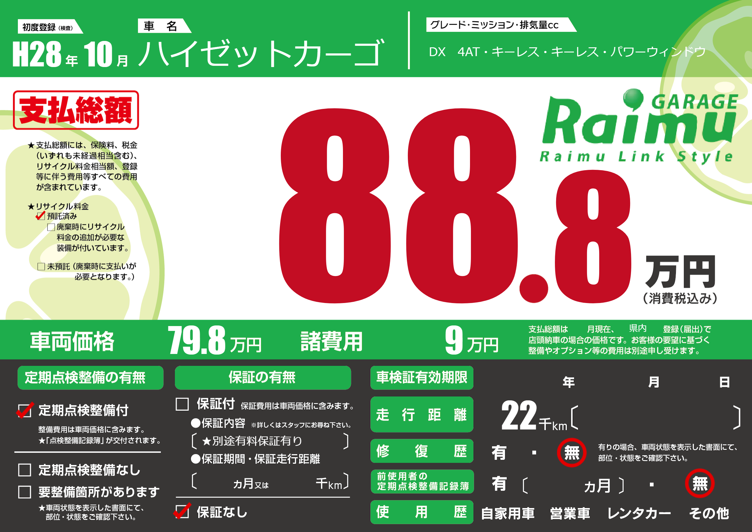 保証なし 保証内容(★別途有料保証有り) ---ヶ月または()千kmまで |