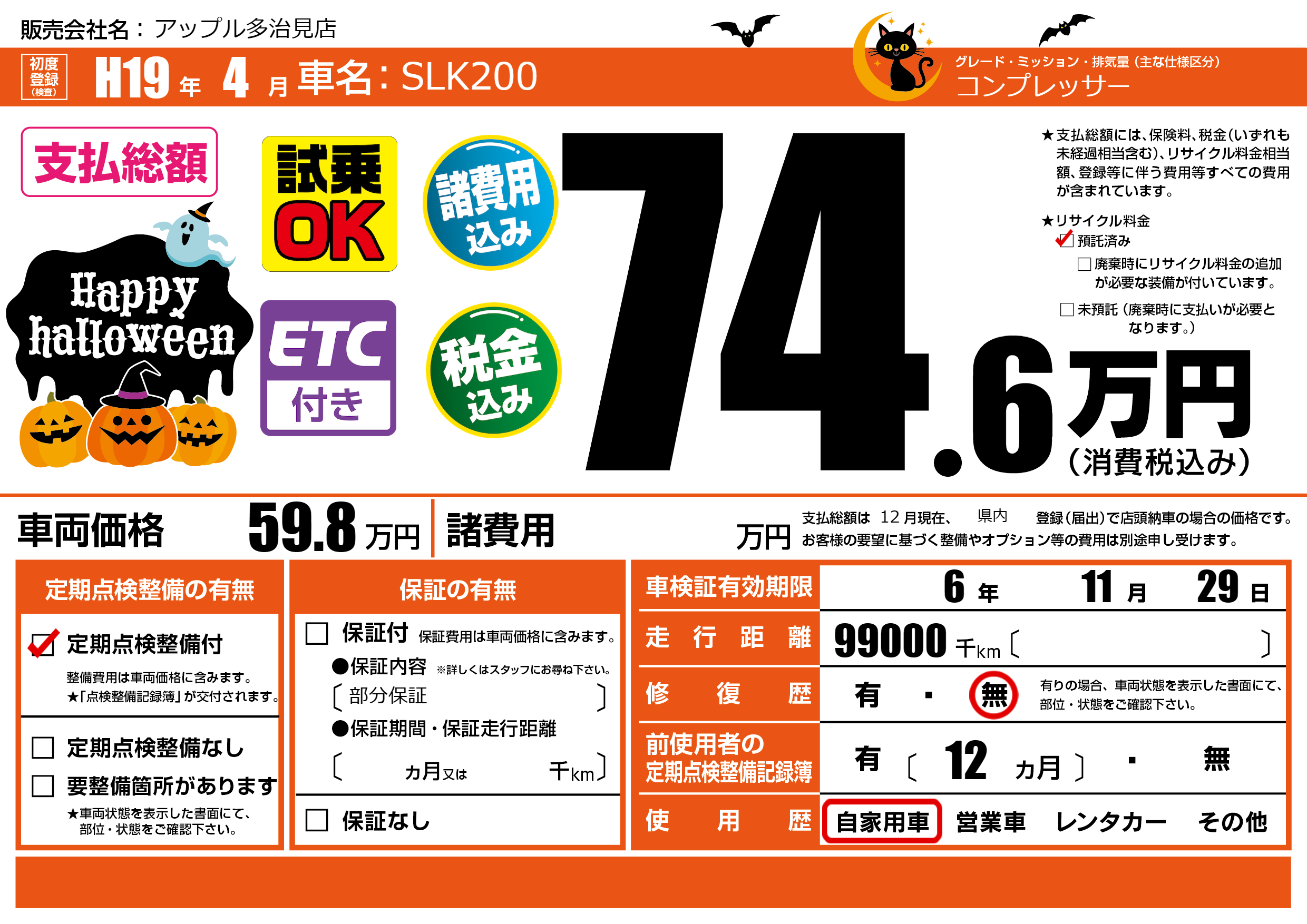 | 車名 | SLK200 | グレード ミッション 排気量 |
