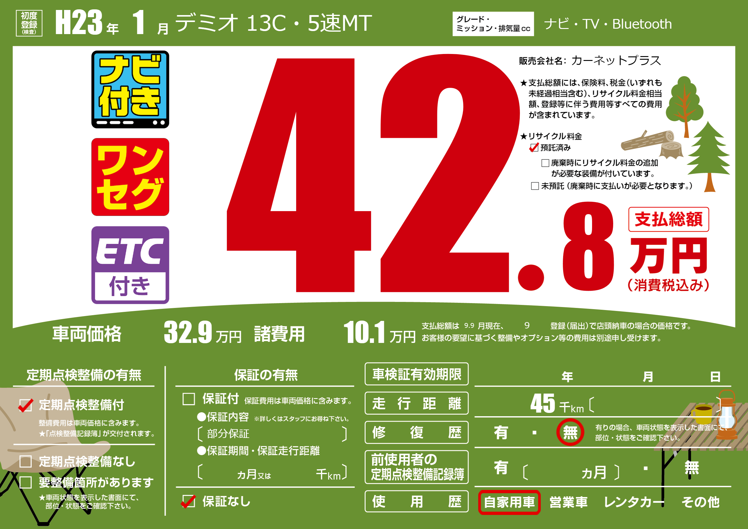 | 車名 | デミオ 13C・5速MT | グレード ミッション 排気量 |